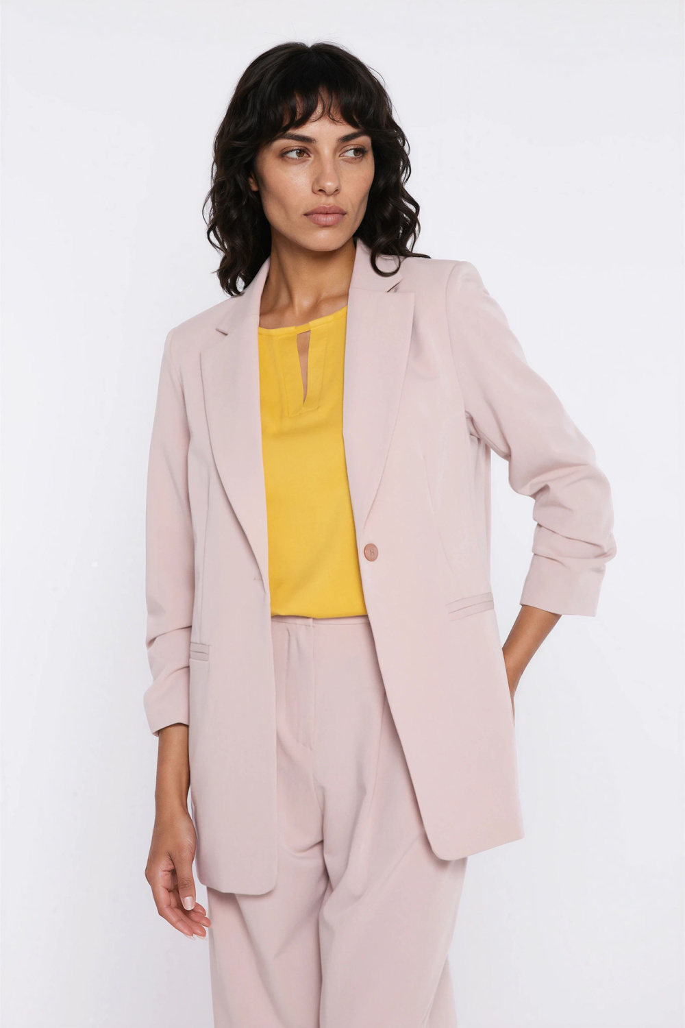 Une veste élégante pour femme de coupe classique régulière est un élément intemporel de la garde-robe, qui conviendra parfaitement aussi bien aux tenues quotidiennes qu’aux tenues plus formelles. Le modèle est doté de revers et de manches 3/4 avec des plis subtils aux extrémités, ce qui ajoute une légèreté délicate et un caractère féminin à l’ensemble. Fermé par un seul bouton, il permet un ajustement rapide et confortable, et les épaulettes modèlent discrètement la silhouette, mettant en valeur la ligne des épaules. À l’avant, il y a des fausses poches qui donnent à la veste un look moderne et à la mode, et la doublure complète assure un confort de port et une durabilité du matériau. C’est un modèle polyvalent qui se marie parfaitement avec un pantalon, une jupe ou une robe, créant des ensembles élégants et élégants pour toutes les occasions.