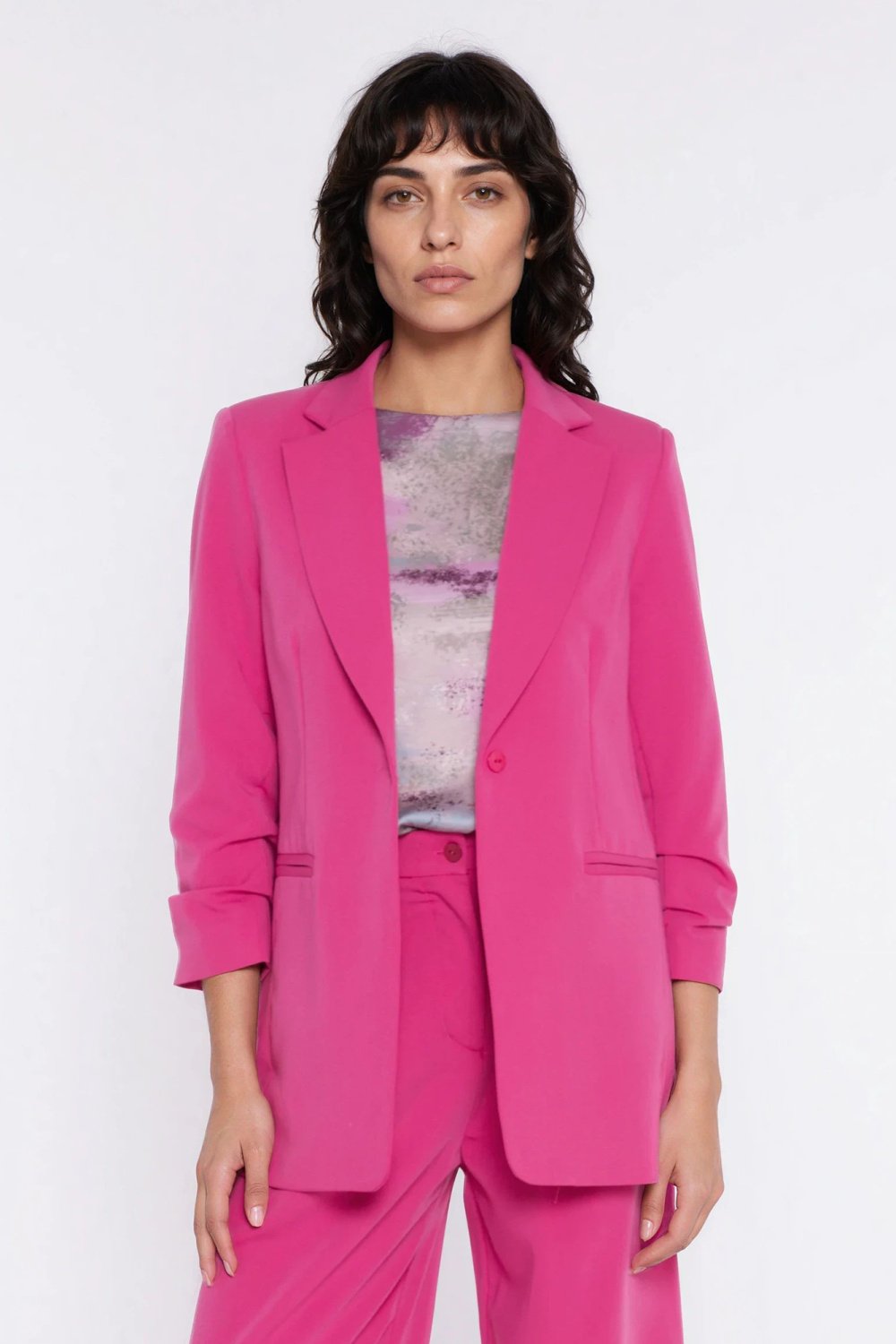 Une veste élégante pour femme, de coupe classique régulière, est un élément intemporel de la garde-robe qui conviendra parfaitement aux tenues quotidiennes ainsi qu’aux styles plus formels. Ce modèle possède des revers et des manches 3/4 avec un léger plissage à la fin, ce qui ajoute une légèreté délicate et un caractère féminin à l’ensemble. Fermé par un bouton, il permet un ajustement rapide et confortable, et les épaulettes subtilement modèlent la silhouette, soulignant la ligne des épaules. À l’avant, il y a des fausses poches qui donnent à la veste un aspect moderne et à la mode, et la doublure complète assure un confort de port et une durabilité du tissu. Il s’agit d’un modèle polyvalent qui se marie parfaitement avec un pantalon, une jupe ou une robe, créant des ensembles élégants et stylés pour toutes les occasions.