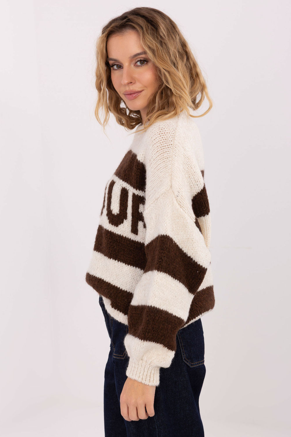 Un pull casual femme oversize de longueur standard, idéal pour les tenues quotidiennes. Fabriqué à partir d’un mélange d’acrylique, de laine, de viscose et de Polyamide, il offre un confort de port, de la douceur et une agréable sensation de chaleur les jours plus frais. Ce modèle se distingue par un motif à rayures à la mode et un logo sur le devant, qui lui donnent un caractère jeune et décontracté. Les manches longues et l’encolure ronde mettent en valeur la coupe classique et confortable, tandis que la coupe oversize ample assure une liberté de mouvement totale. Ce pull n’a pas de fermeture, ce qui permet de l’associer facilement à différents éléments de la garde-robe. Une proposition idéale pour les femmes appréciant le confort associé à un style casual moderne.