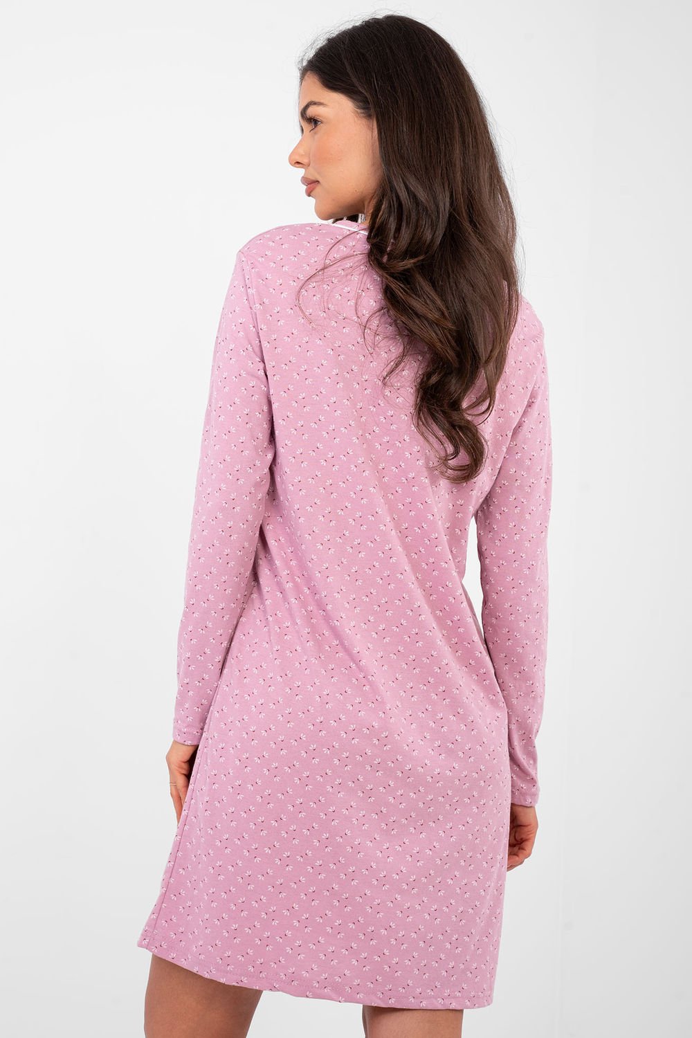 Chemise de nuit à la coupe droite, offrant confort et liberté de mouvement. Fabriquée en coton de haute qualité, doux au toucher, respirant et doux pour la peau. Modèle avec une impression dominante, donnant à l’ensemble un caractère subtil. Col rond fermé par quatre boutons sur le devant ajoutant praticité et charme délicat. Les manches longues font que la chemise convient parfaitement aussi pour les soirées plus fraîches. La longueur juste au-dessus du genou garantit un confort de port et un look classique.