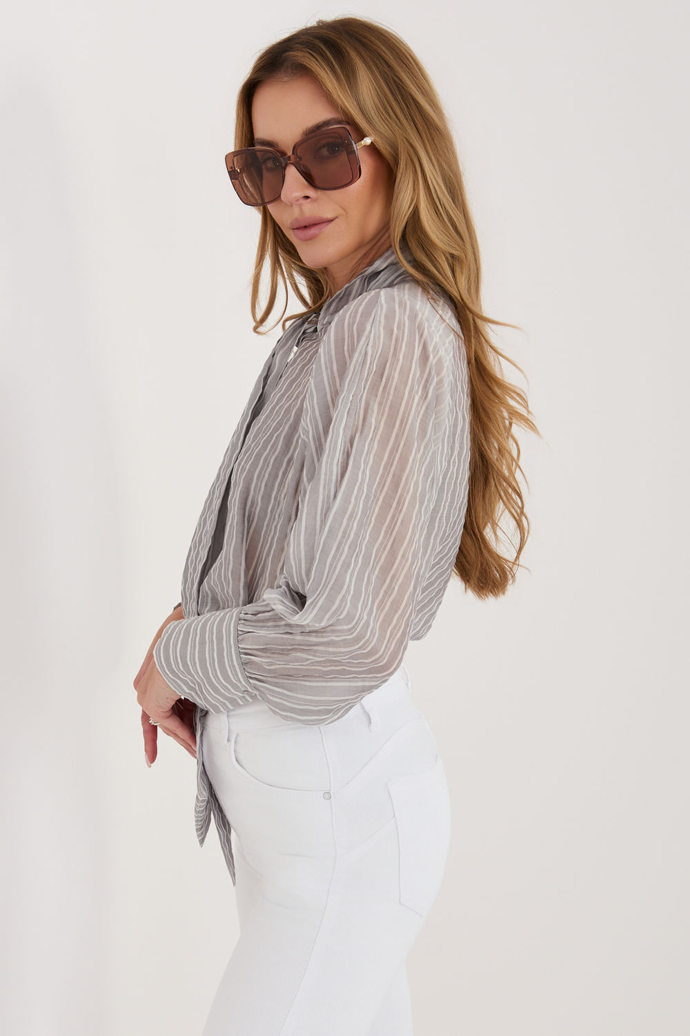 Chemise pour femme de coupe classique, parfaite pour tous les jours, pour le travail et les occasions plus habillées. Ce modèle de longueur standard, boutonné, allie une élégance intemporelle à des détails modernes. Fabriqué dans un mélange agréable de lyocell et de polyester, il offre confort et durabilité. Le tissu est orné d’un motif subtil de fines rayures, qui ajoute légèreté et caractère stylé à l’ensemble. La chemise se distingue par ses manches bouffantes terminées par de larges poignets, qui donnent de l’expression à la silhouette. Un autre atout est le lien au niveau du cou, permettant de créer un élégant nœud papillon ou un nouage décontracté selon l’occasion.