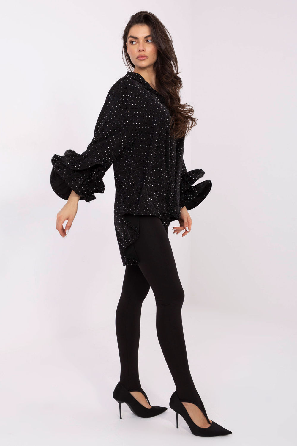 Une chemise élégante pour femme avec un dos prolongé est un modèle exceptionnel qui allie une coupe classique à un caractère raffiné et festif. Conçu dans un style élégant, il convient parfaitement aux occasions formelles, aux cérémonies, aux banquets, ainsi qu’aux sorties et aux fêtes du soir. Toute la surface de la chemise est ornée d’applications de strass, créant un motif brillant et spectaculaire qui ajoute un aspect luxueux à l’ensemble. La coupe longue avec un dos prolongé affine subtilement la silhouette et se présente de manière très élégante. Fabriquée à partir d’un mélange de coton, d’élasthanne et de polyester, la chemise est à la fois confortable à porter, élastique et résistante aux plis. La longue manche ornée de volants apporte une touche féminine et légèrement romantique, tandis que le col classique souligne le caractère formel du modèle. La chemise se ferme par des boutons, ce qui permet d’ajuster la profondeur du décolleté et facilite l’enfilage. C’est une proposition idéale pour les femmes qui apprécient l’élégance, mais qui aiment aussi l’éclat et les finitions modernes. Parfaite pour les occasions spéciales et les sorties stylées.