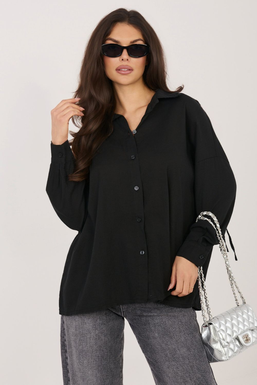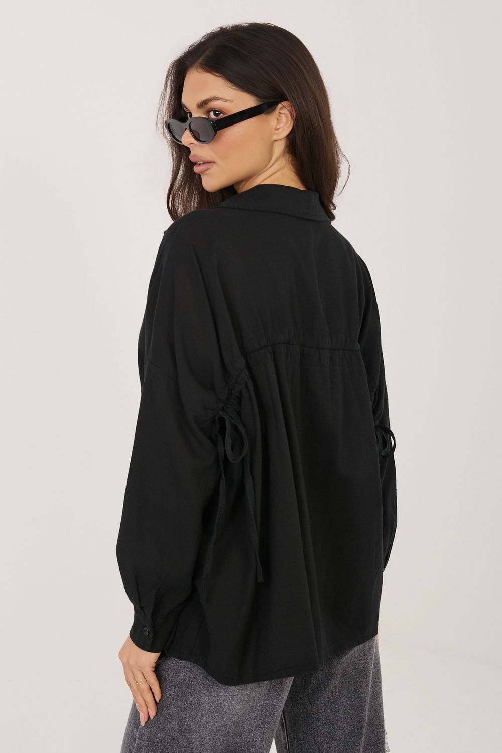 Chemise pour femme de style décontracté, parfaite aussi bien pour les tenues quotidiennes que pour le travail. Son motif classique lisse rend ce modèle polyvalent et facile à combiner avec différents éléments de garde-robe, des pantalons élégants aux jeans. La chemise est fabriquée dans un mélange de lyocell, de coton et de lin de haute qualité, ce qui rend le tissu léger, aéré et agréable à porter. Sa longueur standard permet de la porter rentrée dans un pantalon ou une jupe, ou de la porter de manière décontractée. Le modèle est doté d’un col classique et de manches longues qui soulignent le caractère intemporel de la chemise. Un atout supplémentaire est le pratique laçage dans le dos, qui permet d’ajuster la largeur de la chemise et de mieux l’adapter à la silhouette, tout en ajoutant une touche subtile et féminine à l’ensemble.