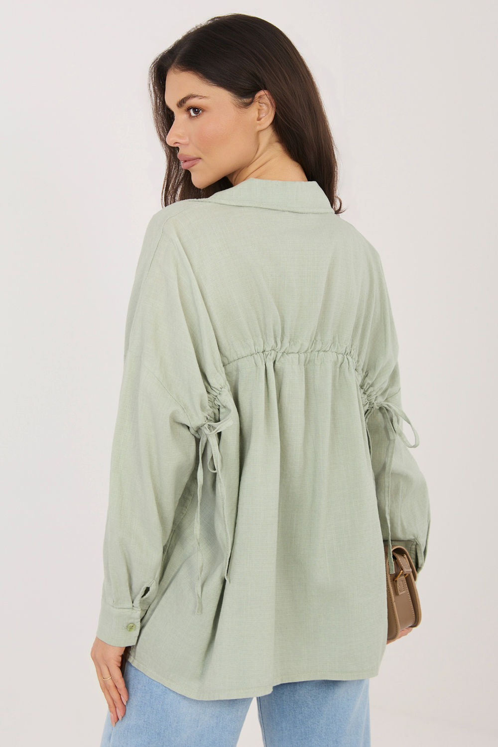 Chemise pour femme de style décontracté, qui conviendra parfaitement aussi bien dans les tenues quotidiennes que au travail. Le motif classique et lisse rend le modèle universel et facile à combiner avec différents éléments de la garde-robe, des pantalons élégants aux jeans. La chemise est fabriquée dans un mélange de lyocell, de coton et de lin de haute qualité, ce qui rend le matériau léger, aéré et agréable à porter. La longueur standard permet de la porter rentrée dans un pantalon ou une jupe, ou de manière décontractée. Le modèle comporte un col classique ainsi que des manches longues qui soulignent le caractère intemporel de la chemise. Un atout supplémentaire est la pratique attache dans le dos, qui permet d’ajuster la largeur de la chemise et de mieux l’adapter à la silhouette, tout en ajoutant une touche subtile et féminine à l’ensemble.