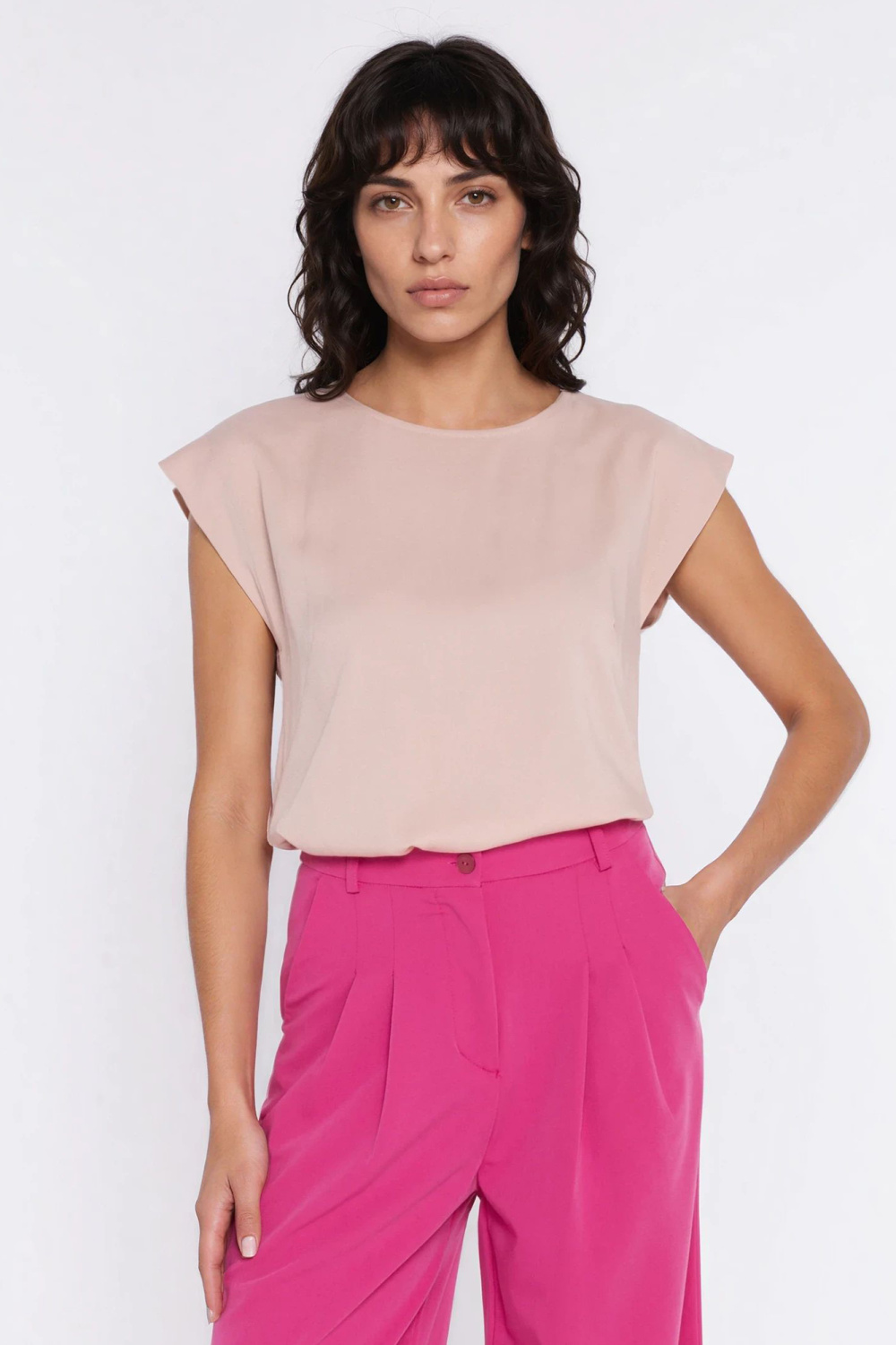 Chemisier de coupe classique et régulière, offrant confort et liberté de mouvement. Fabriqué en viscose légère et agréable au toucher, il conviendra parfaitement au quotidien. Modèle avec encolure ronde et manches courtes de type kimono, donnant à l’ensemble un caractère subtilement décontracté. À l’arrière, il y a une fermeture délicate avec un bouton pour faciliter l’enfilage. Les fentes supplémentaires sur les côtés en bas soulignent la légèreté de la coupe. Chemisier à enfiler par la tête.
