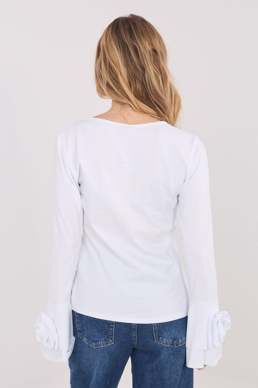 Chemisier élégant de type longsleeve à la coupe ajustée, qui met en valeur la silhouette de manière spectaculaire et associe le classique à des détails décoratifs. Fabriqué en coton de haute qualité, il assure un confort de port et un ajustement agréable toute la journée. Le modèle au motif lisse a un décolleté en V qui met subtilement en valeur le cou et ajoute un caractère féminin. Les manches longues évasées apportent légèreté et élégance, tandis que les fleurs décoratives en tissu placées sur les manches et le décolleté constituent un accent décoratif exceptionnel. Sa longueur standard en fait un choix parfait pour les tenues quotidiennes, le travail, les réunions officielles, ainsi que pour les sorties élégantes ou les soirées.