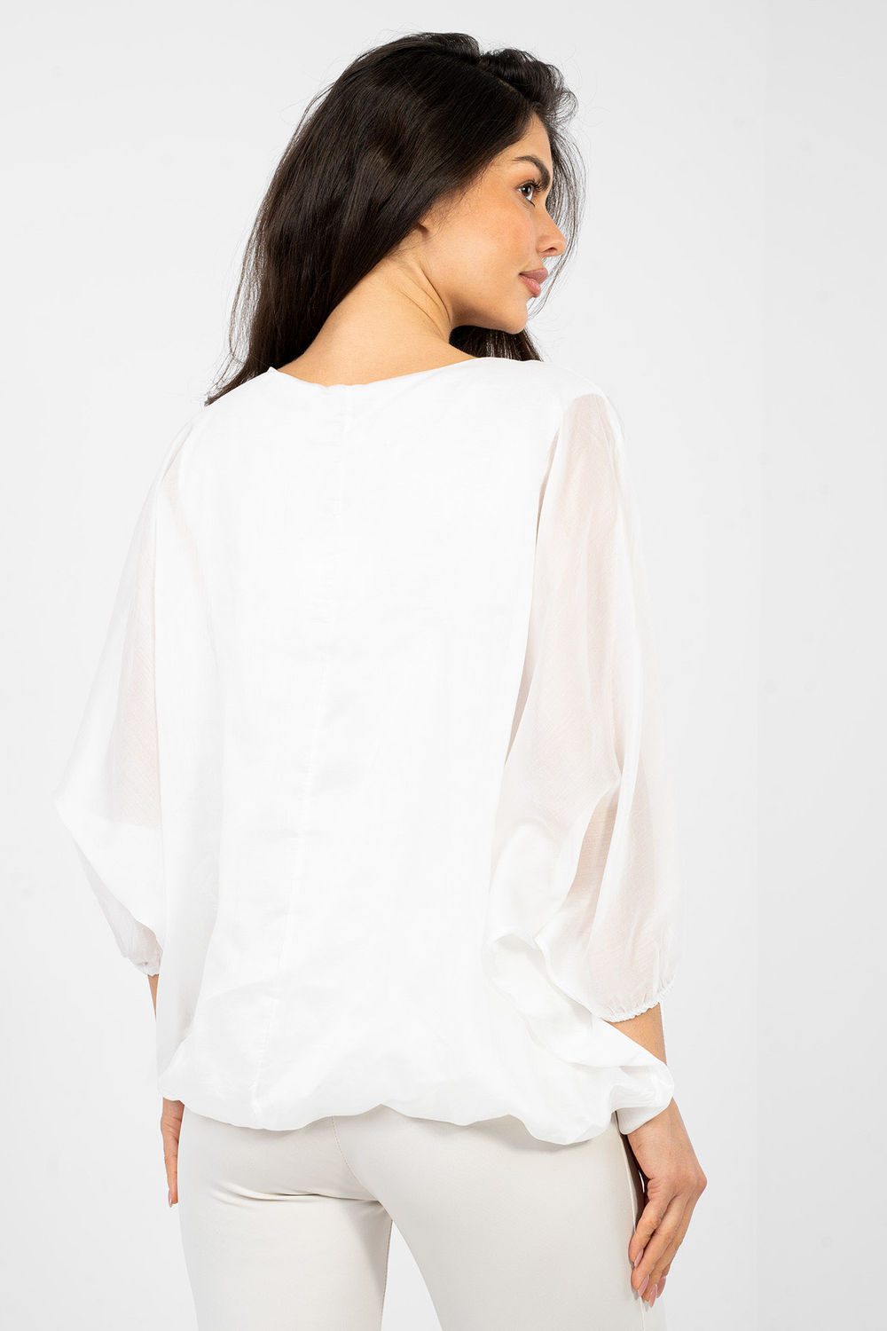 Chemisier élégant de longueur standard, parfait pour le travail et les occasions spéciales, alliant un look élégant au confort de port. Le modèle fabriqué à partir d’un mélange de tencel et de polyester assure une douceur agréable et une durabilité du matériau. Le chemisier a un décolleté classique et rond, des manches 3/4, et un motif lisse qui lui donne un caractère universel. Un autre avantage est la doublure dans la partie centrale, qui modèle subtilement la silhouette et assure un ajustement élégant sous les vêtements. Idéal aussi bien pour les tenues de bureau que pour les sorties plus formelles.