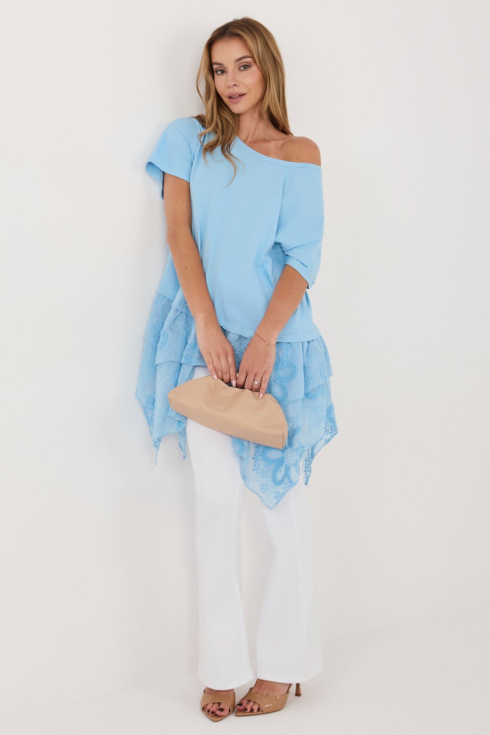 Chemisier pour femme unique dans le style boho, alliant confort et élégance féminine subtile. Ce modèle plus long est doté d’un col rond classique et de manches courtes, offrant ainsi un confort de port et une liberté de mouvement. Le chemisier est maintenu dans un motif lisse, soulignant son caractère minimaliste et élégant. Fabriqué en coton naturel, il est doux, respirant et agréable pour la peau, ce qui le rend parfait pour les journées plus chaudes. L’ornement particulier du modèle est la ruche brodée asymétrique cousue en bas, qui apporte de la légèreté à l’ensemble et souligne le caractère boho du chemisier. C’est une proposition idéale pour les tenues de tous les jours, se marie parfaitement avec des jeans, des leggings ou des pantalons ajustés.