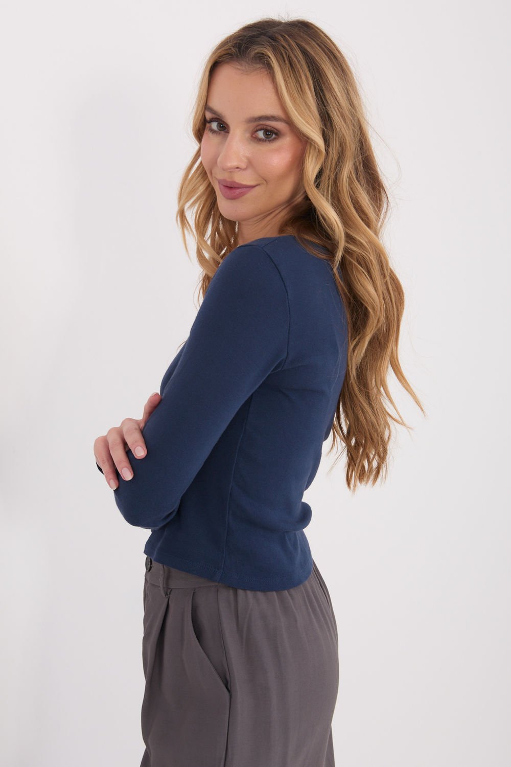 Le haut à manches longues ajusté est une excellente base pour les tenues quotidiennes dans un style décontracté. La coupe courte souligne subtilement la silhouette et se marie parfaitement avec un jean, un pantalon en tissu ou une jupe taille haute. Ce modèle conviendra aussi bien pour la journée que pour le travail, alliant confort et design polyvalent. Le haut est fabriqué en coton de haute qualité, assurant confort, respirabilité et douceur au toucher. Son motif lisse lui donne un caractère intemporel et facilite la création de différentes tenues. Le modèle a des manches longues et un col rond classique boutonné avec trois boutons. Ce détail subtil ajoute une touche de charme féminin à l’ensemble et permet d’ajuster légèrement la profondeur du décolleté. C’est une proposition pratique, élégante et polyvalente pour toute garde-robe.