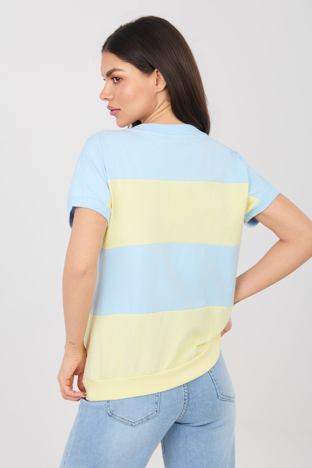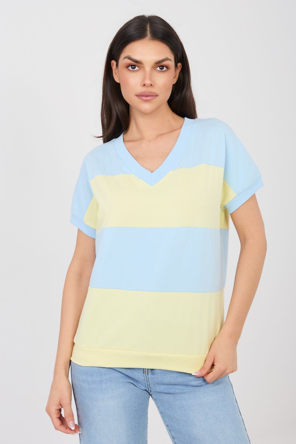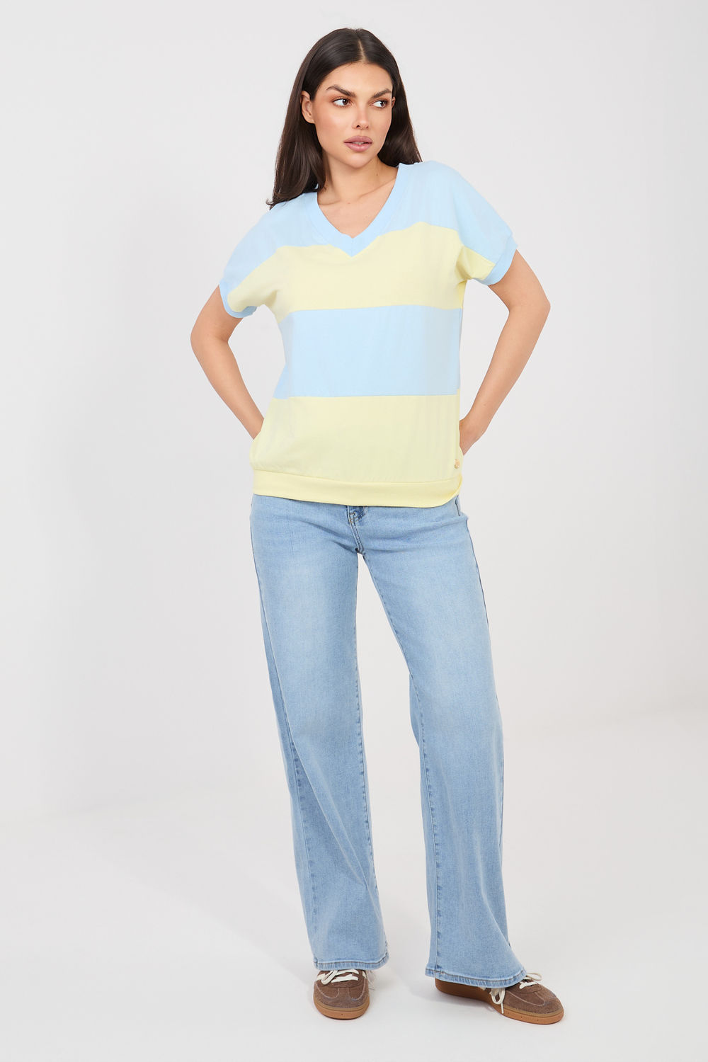 Chemisier élégant pour femme dans un style décontracté, idéal pour tous les jours. Ce modèle de longueur standard a des manches courtes et un décolleté en V féminin qui souligne subtilement la ligne du cou et ajoute de la légèreté à toute la tenue. L’élément dominant du design sont les larges rayures qui confèrent au chemisier un caractère à la mode et intemporel. La coupe simple et confortable permet au modèle de bien se placer sur la silhouette et assure une liberté de mouvement lors de l’utilisation quotidienne. Le chemisier est fabriqué en coton de haute qualité avec une touche d’élasthanne, ce qui rend le tissu doux, agréable pour la peau et légèrement élastique. Le modèle sans fermeture souligne son caractère confortable et quotidien et se marie parfaitement avec de nombreuses tenues décontractées.