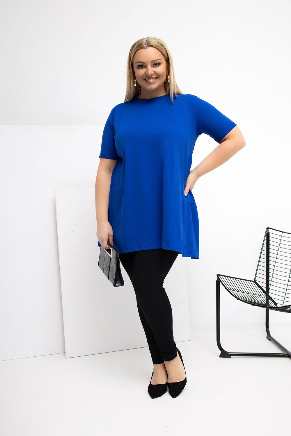 T-shirt allongé dans un style décontracté, idéal pour les occasions quotidiennes. Fabriqué en coton doux au toucher avec une touche d’élasthanne, il est doux, élastique et confortable à porter toute la journée. Le motif lisse permet au t-shirt de s’adapter facilement à de nombreuses tenues. Le modèle a un col rond et des manches courtes, ce qui lui donne un caractère universel et décontracté. L’absence de fermeture souligne la forme simple et confortable. Un volant à l’ourlet arrière est un atout supplémentaire qui anime subtilement la coupe et lui ajoute un charme féminin. Une proposition idéale pour tous les jours avec un jean, des leggings ou une jupe.