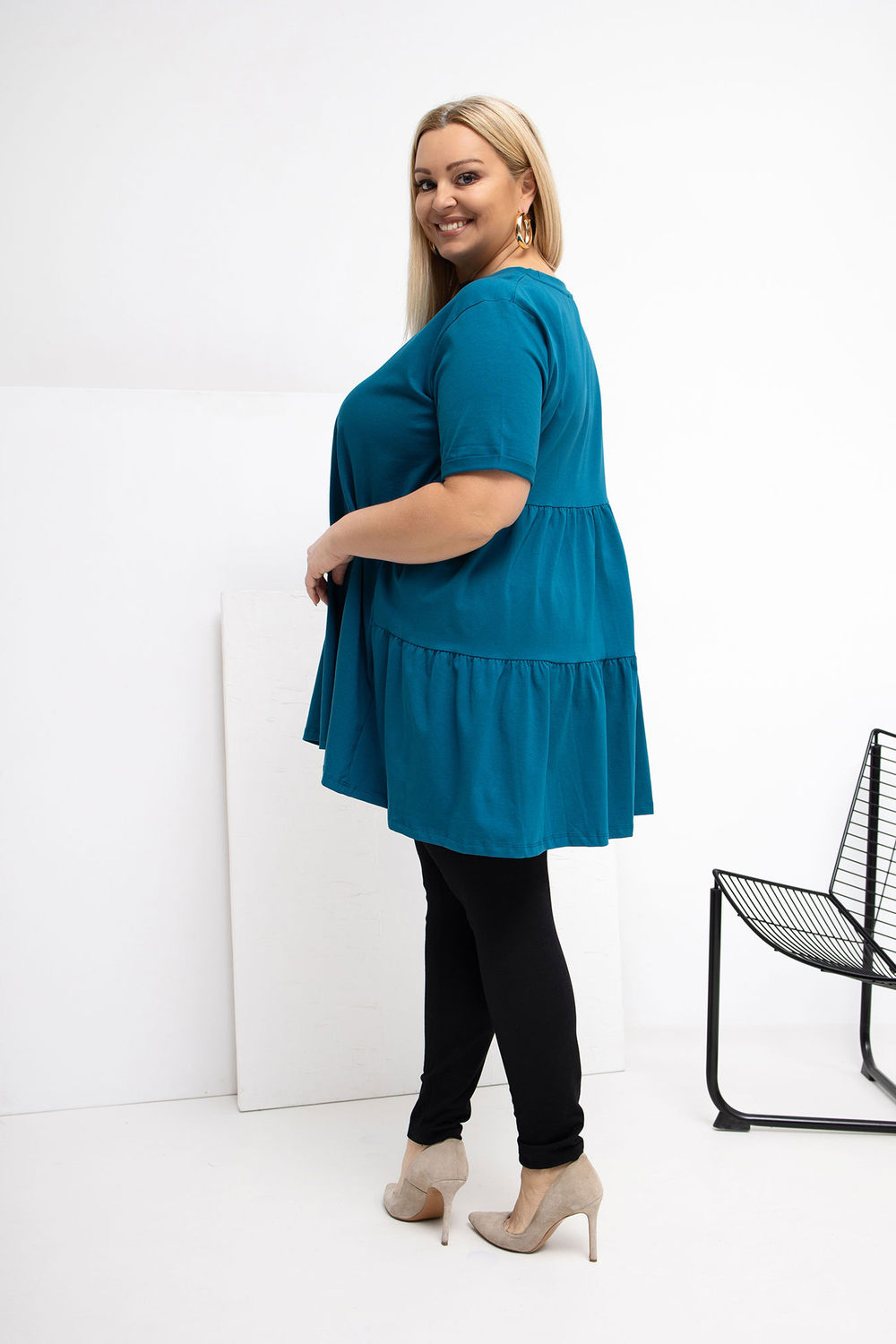 T-shirt allongé dans un style décontracté, idéal pour les occasions quotidiennes. Fabriqué en coton agréable au toucher avec une touche d’élasthanne, ce qui le rend doux, élastique et confortable à porter toute la journée. Le motif lisse permet au t-shirt de s’adapter facilement à de nombreuses tenues. Le modèle a un col rond et des manches courtes, lui donnant un caractère universel et décontracté. L’absence de fermeture souligne la forme simple et confortable. Un volant en bas à l’arrière est un atout supplémentaire qui donne de la vie à la coupe et lui ajoute un charme féminin. Une proposition idéale au quotidien avec des jeans, des leggings ou une jupe.