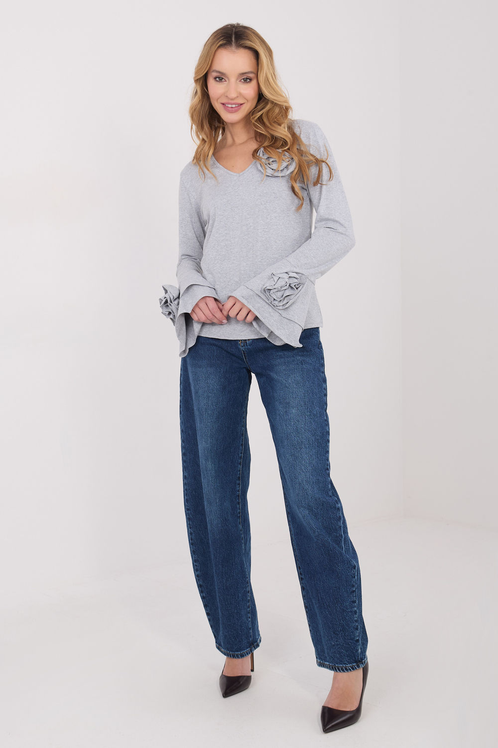 Chemisier élégant de type longsleeve à la coupe ajustée, qui souligne efficacement la silhouette et marie le classique avec des détails décoratifs. Fabriqué en coton de haute qualité, il assure un confort de port et un ajustement agréable toute la journée. Le modèle au motif lisse a un décolleté en V qui met subtilement en valeur le cou et ajoute un caractère féminin. Les manches longues évasées apportent légèreté et élégance, tandis que les fleurs décoratives en tissu placées sur les manches et le décolleté ajoutent une touche décorative unique. Sa longueur standard fait que le chemisier convient parfaitement aux tenues quotidiennes, au travail, aux réunions professionnelles, ainsi qu’aux sorties élégantes ou aux soirées.