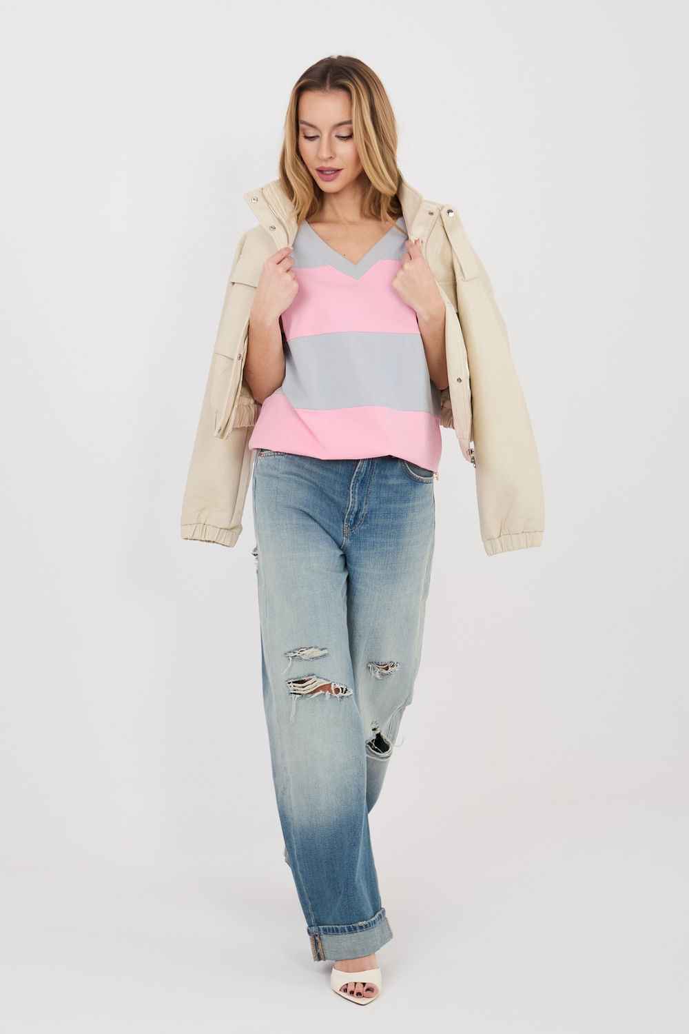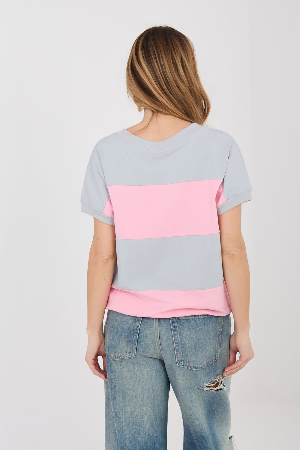 Élégant chemisier féminin dans une version décontractée, idéal pour tous les jours. Ce modèle de longueur standard a des manches courtes et un décolleté en V féminin qui souligne subtilement la ligne du cou et ajoute de la légèreté à toute la tenue. L’élément dominant du design est les larges rayures, qui donnent au chemisier un caractère à la mode et intemporel. La coupe simple et confortable fait que le modèle s’ajuste bien à la silhouette et offre une grande liberté de mouvement lors de l’utilisation quotidienne. Le chemisier est fabriqué en coton de haute qualité avec une touche d’élasthanne, ce qui rend le tissu doux, agréable pour la peau et légèrement élastique. Le modèle sans fermeture souligne son caractère confortable et quotidien, et le rend parfait pour de nombreuses tenues décontractées.