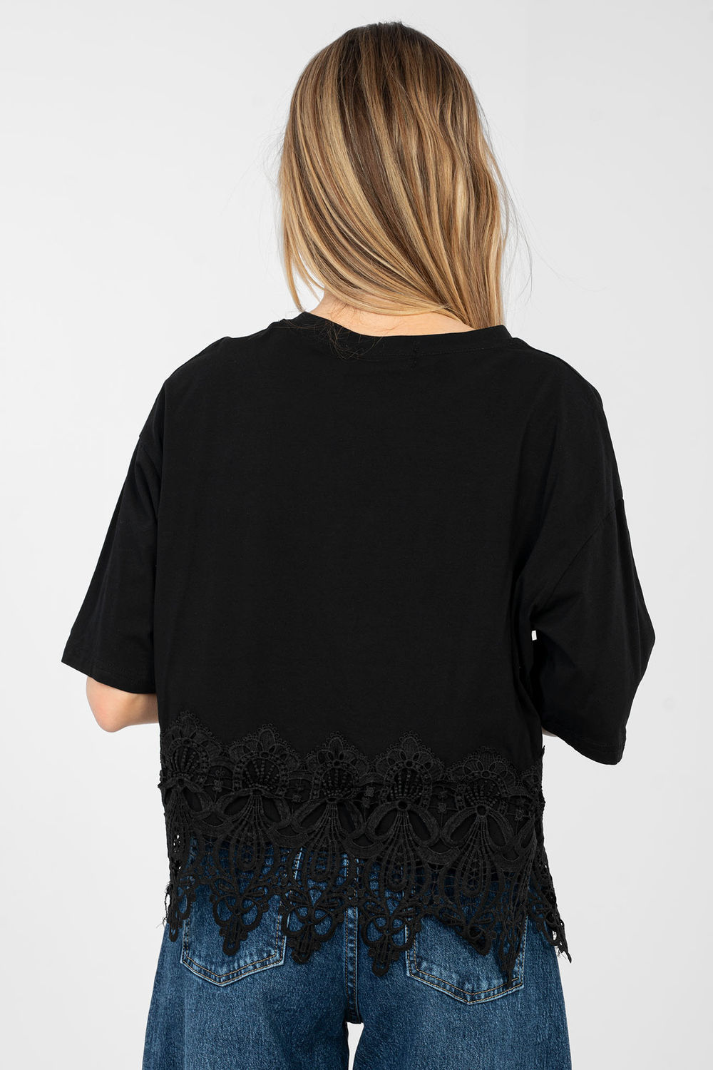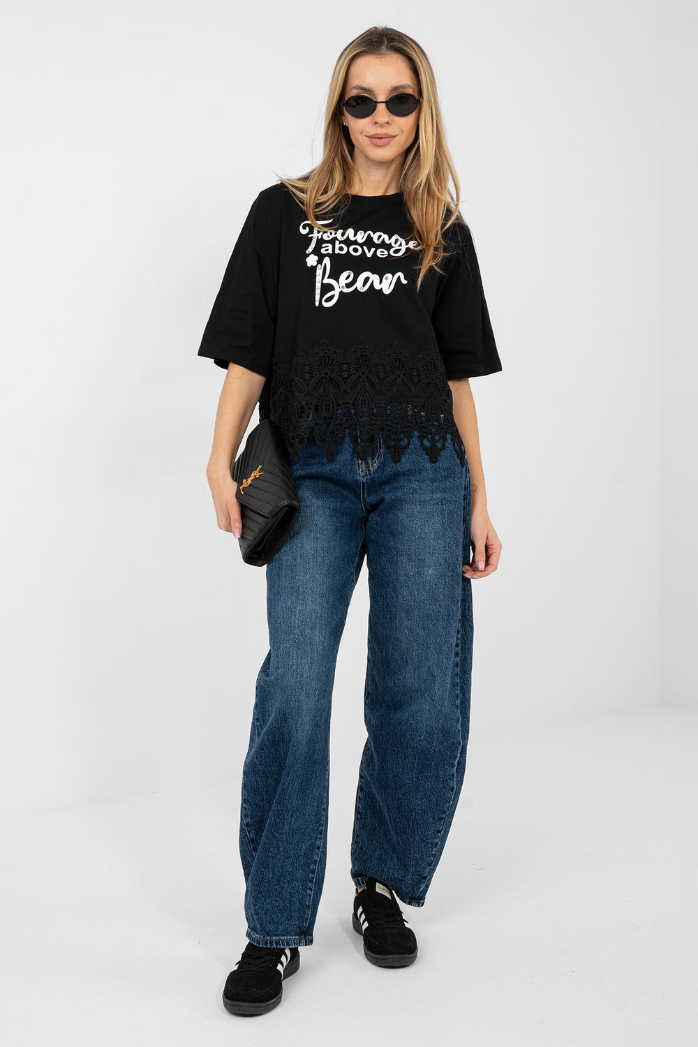 Chemisier féminin quotidien au caractère féminin et élégant. Fabriqué en coton de haute qualité avec une touche d’élasthanne, il assure confort, élasticité et ajustement parfait à la silhouette. Ce modèle de longueur courte et à manches courtes sera parfait pour les jours plus chauds. L’encolure ronde souligne la coupe classique et donne au chemisier un look universel. Les inscriptions décoratives sur le devant, ornées de zircons, attirent le regard et ajoutent une touche de mode à l’ensemble. Le détail en dentelle en bas du chemisier et les zircons subtils ajoutent une touche de brillance féminine. Idéal pour des tenues quotidiennes avec des jeans, des shorts ou une jupe.