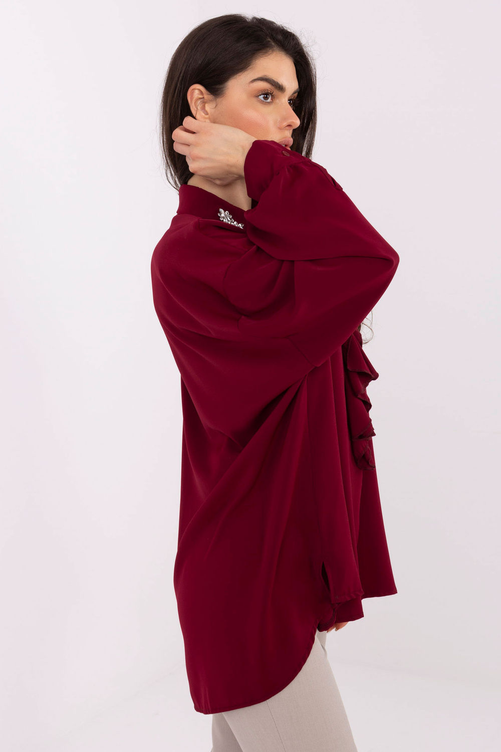 Une blouse élégante unique créée pour des occasions spéciales, le travail et les sorties en soirée. Son motif lisse apporte une touche de classe et d’élégance subtile, ce qui la rend parfaitement adaptée à des tenues formelles ainsi qu’à des styles plus nocturnes. Le modèle est fabriqué en polyester léger et agréable au toucher, qui se pose joliment sur la silhouette. Sa longueur longue, avec l’arrière caractéristiquement plus long que l’avant, confère à la blouse un caractère moderne et incroyablement féminin. La blouse séduit par ses détails, son large col orné et son jabot subtil soulignent son style élégant. Les manches bouffantes ajoutent de la légèreté et une forme à la mode et expressive, créant un ensemble spectaculaire mais toujours très harmonieux. L’absence de fermeture rend la blouse confortable et facile à enfiler. C’est le modèle idéal pour les femmes qui apprécient l’élégance, le confort et les détails originaux dans leurs tenues quotidiennes et spéciales.