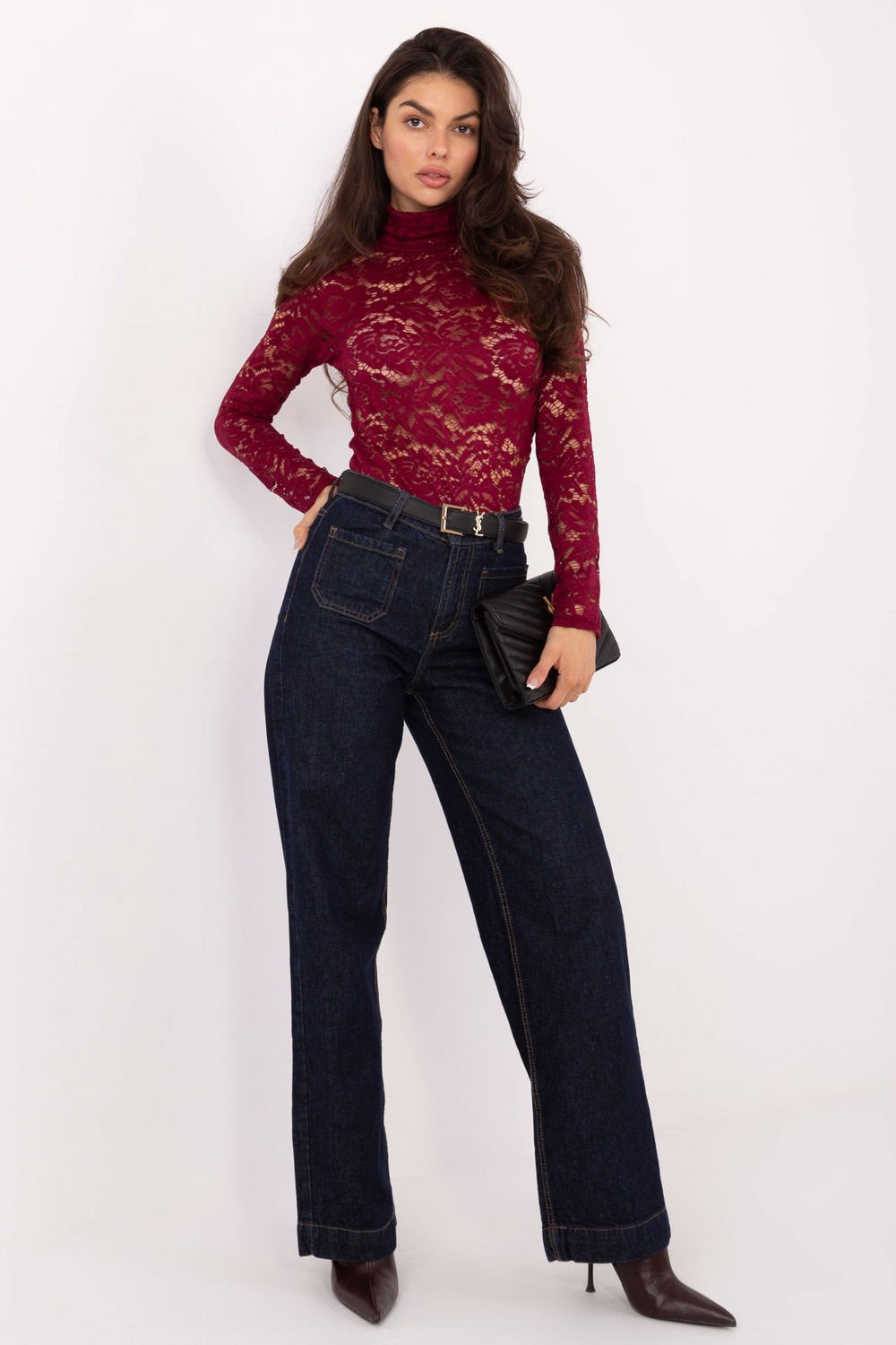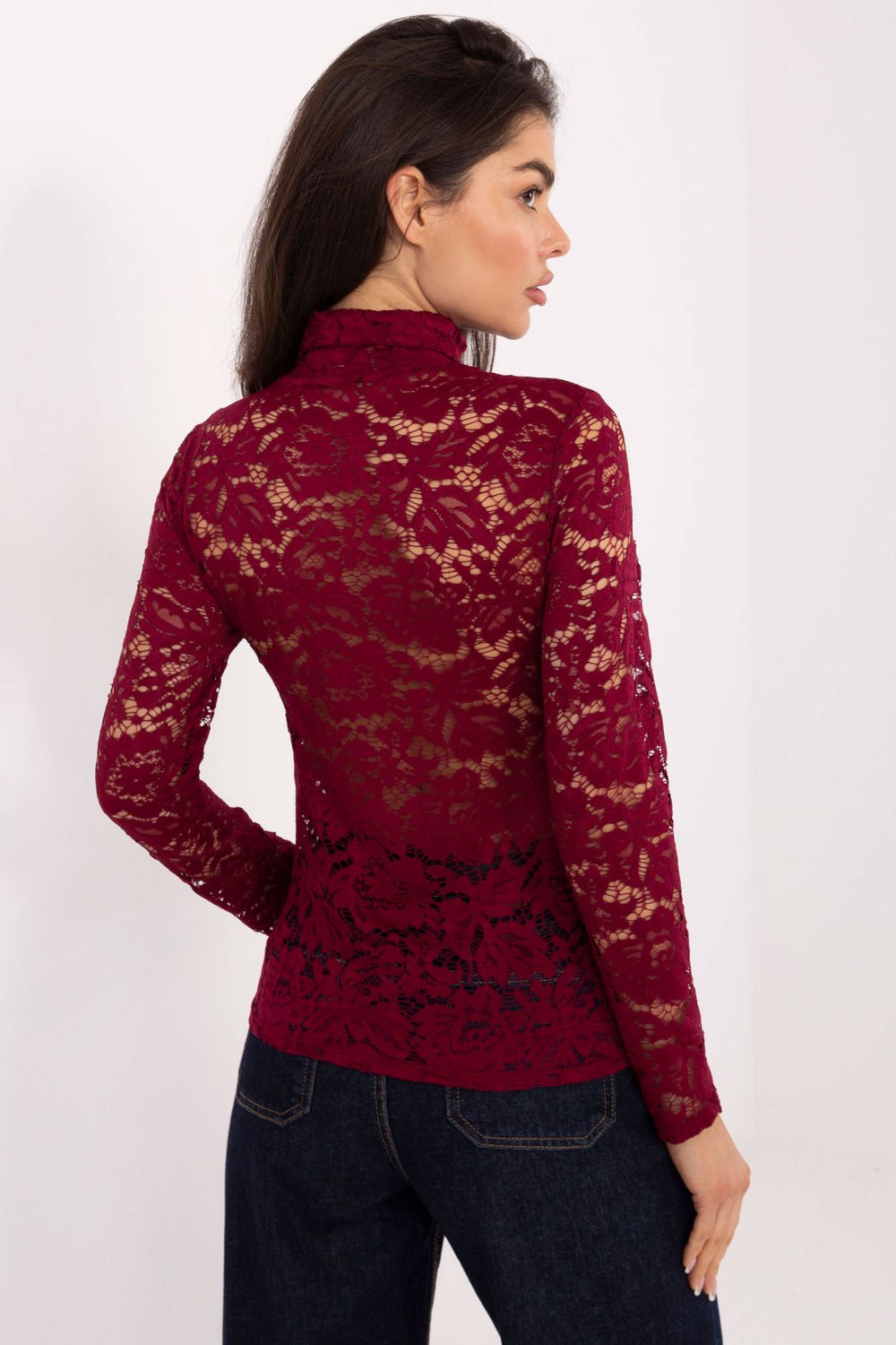 Chic blouse en dentelle de coupe ajustée, idéale pour des occasions spéciales et des rencontres élégantes. Fabriqué à partir de matériaux de haute qualité tels que le polyester, la viscose et l’élasthanne, offrant un confort de port et un ajustement subtil à la silhouette. Le modèle se caractérise par une longueur standard et une texture raffinée du matériau en dentelle, qui ajoute un charme exceptionnel à l’ensemble. Les manches longues et le col roulé soulignent le style élégant de la blouse, en faisant un excellent choix pour les sorties habillées.