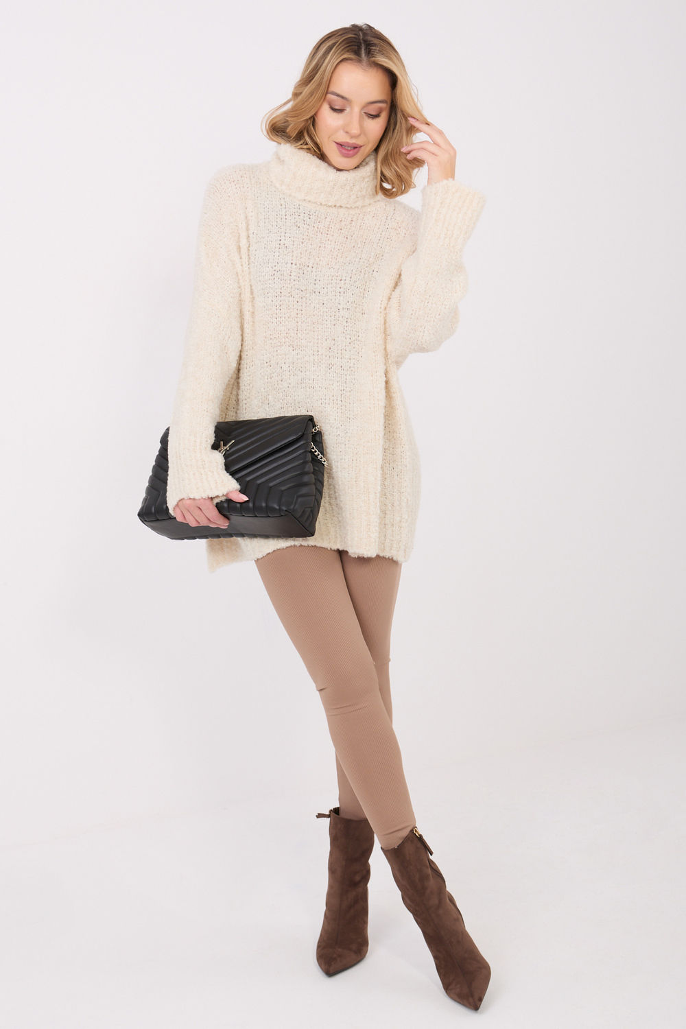 Le pull en boucle pour femme avec un col roulé est une proposition élégante et confortable pour les tenues de tous les jours. Sa structure caractéristique en boucle lui donne un aspect moderne et douillet, parfait pour les journées plus fraîches. Fabriqué à partir d’un mélange de haute qualité d’acrylique, de laine, de viscose et de Polyamide, il assure chaleur, douceur et durabilité. Ce modèle long avec des manches longues épouse parfaitement la silhouette et garantit un grand confort. Le col roulé protège efficacement du froid, et l’absence de fermeture souligne le caractère simple et décontracté du pull. Son motif lisse en fait un élément polyvalent de la garde-robe, qui se marie parfaitement aussi bien avec un jean qu’avec un legging ou une jupe.