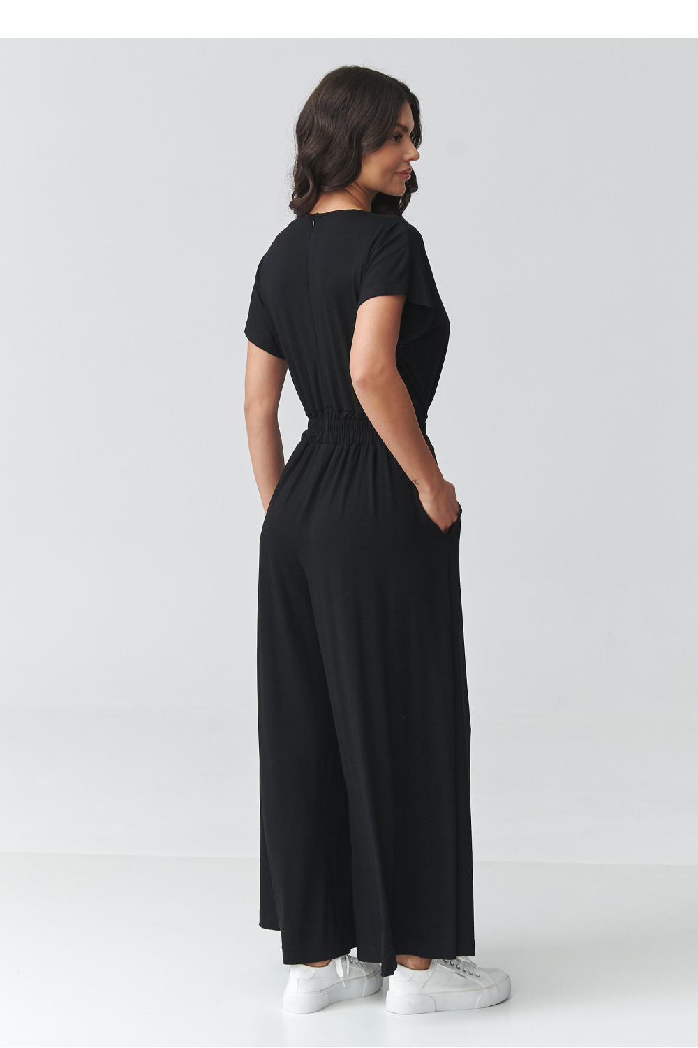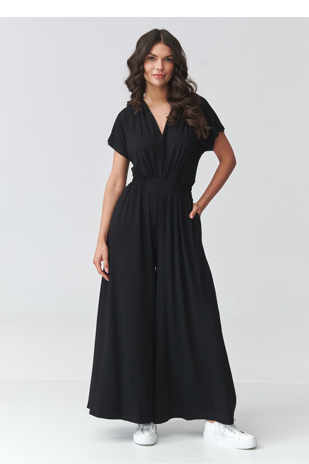 Combinaison moderne pour femme avec des jambes larges est une excellente proposition pour les femmes qui apprécient le style et le confort en un seul. La coupe ample et fluide se pose magnifiquement sur la silhouette, et les plis élastiques à la taille la mettent subtilement en valeur. Le profond décolleté en V affine le cou et ajoute une touche féminine à l’ensemble. Cette élégante combinaison à manches courtes conviendra parfaitement aux tenues quotidiennes ainsi qu’aux occasions plus formelles. Les jambes larges et tombantes offrent un confort de port et s’inscrivent dans les tendances actuelles. C’est un choix idéal en tant que combinaison pour un mariage, une réception, un rendez-vous ou pour le travail. Grâce à sa coupe polyvalente, ce modèle se marie parfaitement avec des escarpins, des sandales ou des chaussures de sport, créant une tenue dans l’esprit smart casual. Si vous cherchez une alternative à la robe, cette combinaison moderne pour femme sera une excellente solution.