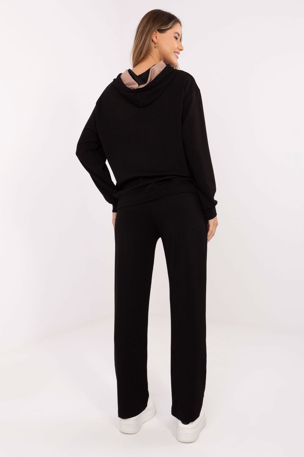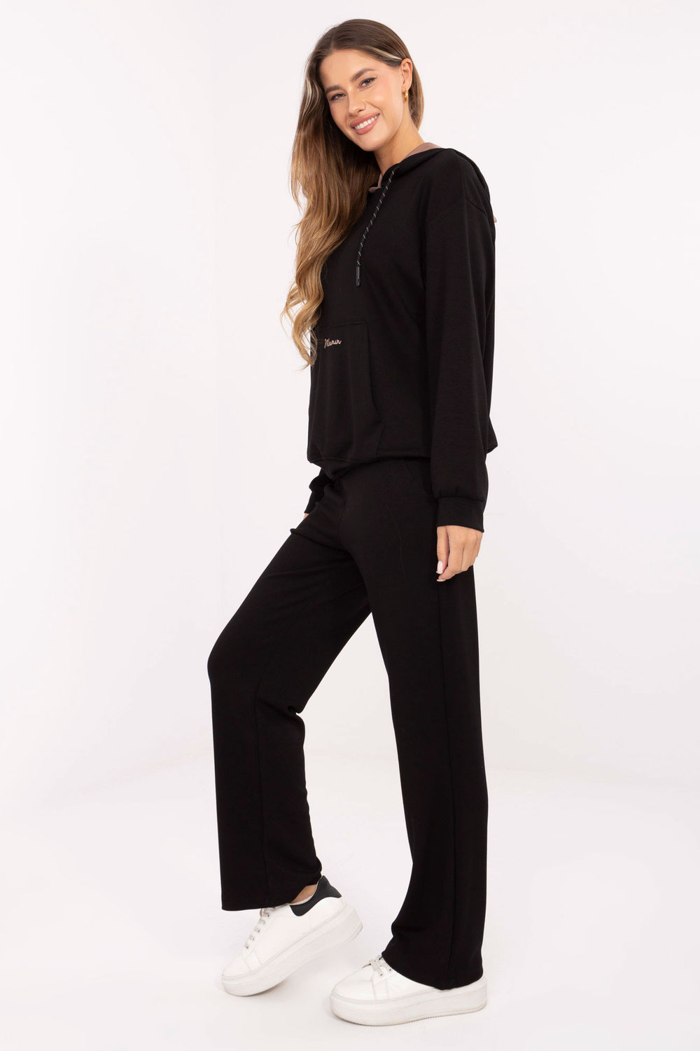 Ensemble de survêtement pour femme composé d’un sweat à capuche et d’un pantalon de style décontracté, idéal pour les occasions quotidiennes. Fabriqué dans un matériau exceptionnellement doux et agréable au toucher, avec une prédominance de viscose et une touche d’élasthanne pour un plus grand confort. Sweat-shirt de longueur standard avec des manches longues, une capuche et une poche kangourou pratique, orné d’une broderie subtile. Pantalon taille haute avec des jambes droites et des poches latérales, également orné d’une petite broderie à la taille. Le matériau lisse et le design minimaliste font de cet ensemble un mélange de confort et de style moderne.