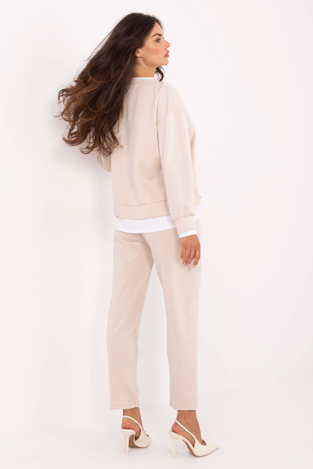 Ensemble féminin décontracté en matériau doux et agréable au toucher. L’ensemble se compose d’un sweat à col rond et d’un pantalon taille haute, créant une tenue confortable et stylée pour tous les jours. Le sweat a des manches longues, un col et un bas doublés de tissu contrasté et une discrète broderie. Le pantalon à jambes droites est doté d’une taille haute à lacets et de poches latérales, offrant confort et coupe moderne. Le motif lisse et la combinaison de viscose et d’élasthanne garantissent douceur, élasticité et liberté de mouvement. Cet ensemble est parfait pour les sorties quotidiennes, alliant confort, élégance et style décontracté.