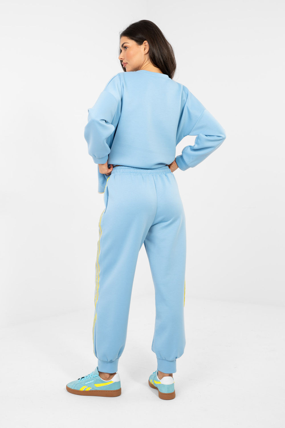 Un ensemble de survêtement élégant composé d’un sweat-shirt et d’un pantalon est une proposition idéale pour tous les jours pour les personnes qui apprécient le confort dans un style tendance. Fabriqué à partir d’un mélange de polyester, de viscose et d’élasthanne de haute qualité, le tissu est doux, élastique et agréable au toucher, assurant un confort toute la journée. Le sweat-shirt à encolure ronde classique et à manches longues s’intègre parfaitement dans un style décontracté. Le motif lisse donne à l’ensemble un caractère universel, ce qui permet de l’associer facilement à différents accessoires. Le pantalon taille haute a une taille pratique à nouer pour un ajustement individuel. Le modèle avec des jambes longues terminées par des poignets assure confort et un look sportif. Les poches latérales augmentent la fonctionnalité, et les bandes latérales à la mode sur les côtés des jambes ajoutent un accent dynamique et moderne à l’ensemble. C’est un choix parfait pour les sorties quotidiennes, les promenades ou la détente à la maison, alliant confort et style dans un seul ensemble.