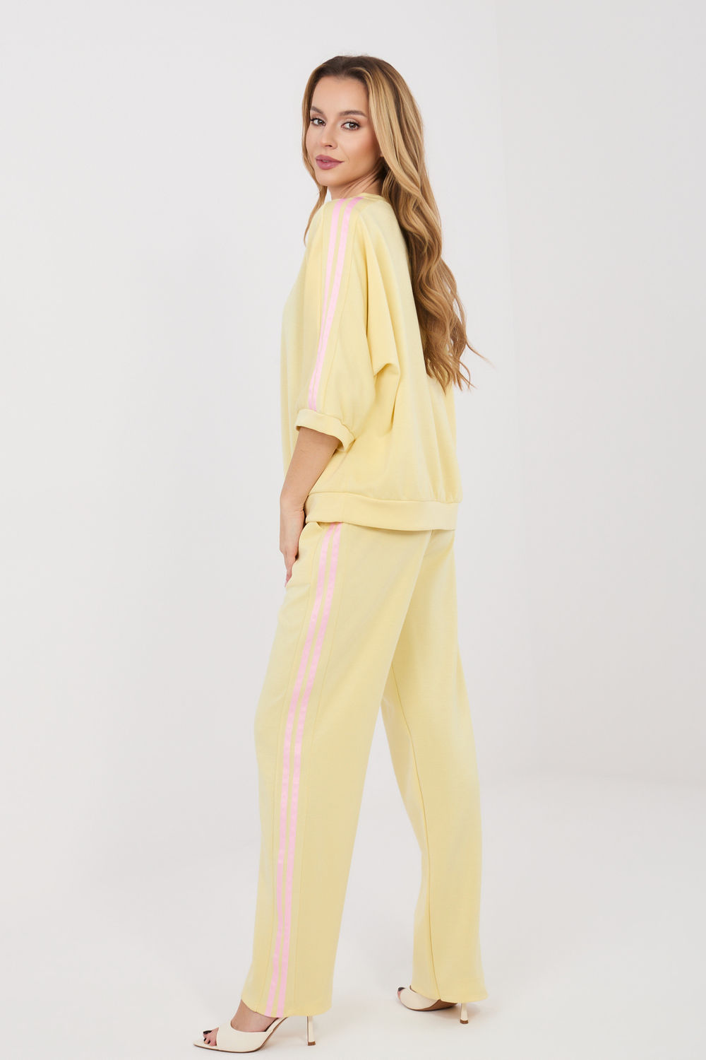 Ensemble de survêtement pour femme composé d’un sweat à capuche et d’un pantalon, idéal pour des tenues décontractées au quotidien. Le motif lisse rend l’ensemble polyvalent et facile à assortir à différentes occasions, des promenades aux achats en passant par la détente à la maison. L’ensemble est fabriqué dans un mélange agréable de polyester, de viscose et d’élasthanne. Le matériau de type « beurre » est exceptionnellement doux, délicat et extrêmement agréable au toucher, offrant ainsi un grand confort et une liberté de mouvement. Le pantalon a une taille haute et des jambes longues et droites qui s’adaptent bien à la silhouette. Il est doté d’une fermeture pratique à la taille pour s’ajuster à la silhouette. Le modèle est également équipé de poches latérales pratiques. Le sweat à capuche avec des manches longues jusqu’au coude complète parfaitement l’ensemble. Les bandes décoratives à la mode le long des manches et des jambes donnent à l’ensemble un caractère sportif et moderne.
