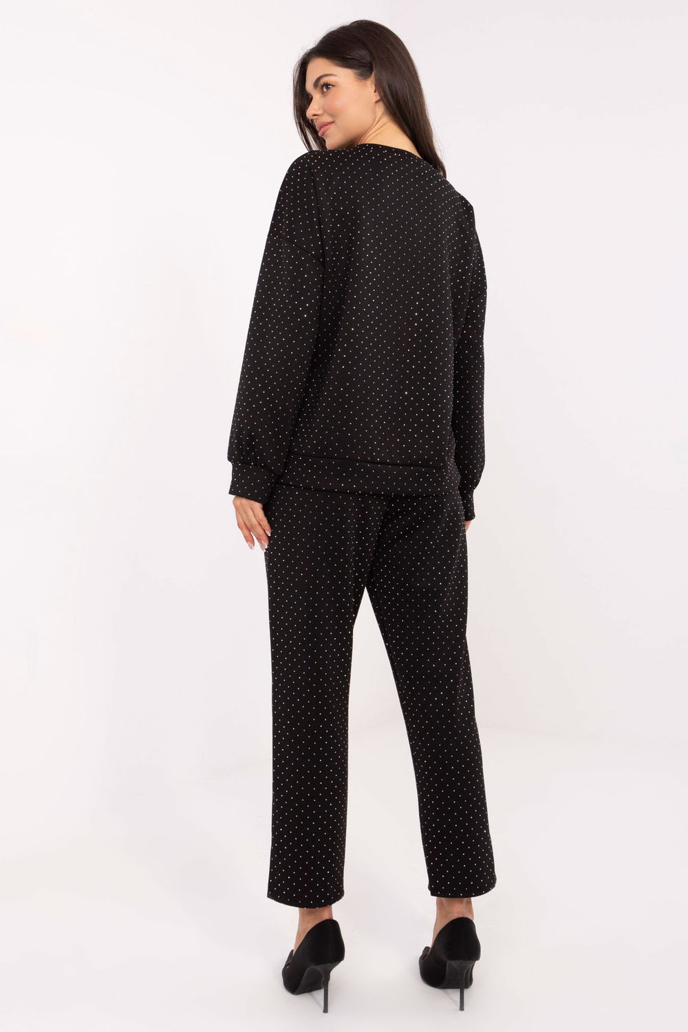 L’ensemble de survêtement pour femme élégant et confortable est une proposition pour les femmes qui apprécient l’élégance au quotidien. L’ensemble se compose d’un sweat-shirt et d’un pantalon, créant un ensemble harmonieux au caractère exceptionnellement féminin. Le modèle est fabriqué dans un mélange doux de viscose et de polyester, qui s’adapte parfaitement à la silhouette, offrant un confort de port et un aspect esthétique. Toute la surface du tissu est ornée d’une application subtile de strass, donnant à l’ensemble un style élégant et élégant. Le pantalon à taille haute, avec des jambes droites et longues et une ceinture à nouer à la taille, souligne la taille et assure un ajustement parfait. Les poches latérales ajoutent de la praticité et de la décontraction à une utilisation quotidienne. Cet ensemble convient parfaitement à de nombreuses occasions, idéal pour le travail, les réunions et la vie quotidienne. Il associe le confort d’un survêtement à l’élégance du style habillé, créant un look universel et moderne.