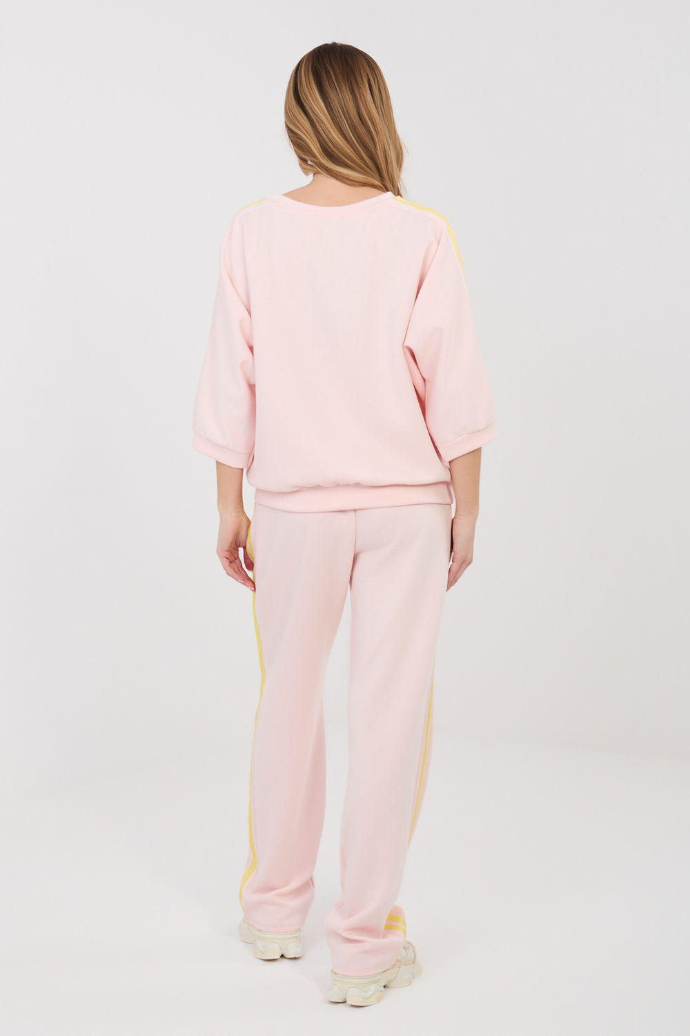 Ensemble de survêtement pour femme composé d’un sweat à capuche et d’un pantalon, idéal pour des tenues décontractées au quotidien. Le motif lisse rend l’ensemble polyvalent et facile à assortir à différentes occasions, des promenades aux achats en passant par la détente à la maison. L’ensemble est fabriqué dans un mélange confortable de polyester, de viscose et d’élasthanne. Le matériau de type « beurre » est exceptionnellement doux, délicat et très agréable au toucher, ce qui garantit un grand confort et une liberté de mouvement. Le pantalon a une taille haute et des jambes longues et droites qui s’adaptent bien à la silhouette. Il comporte une ceinture pratique pour s’ajuster à la forme du corps. Le modèle est également équipé de poches latérales pratiques. Le sweat-shirt à manches longues qui arrivent au coude complète parfaitement l’ensemble. Les bandes à la mode le long des manches et des jambes ajoutent un caractère sportif et moderne à l’ensemble.