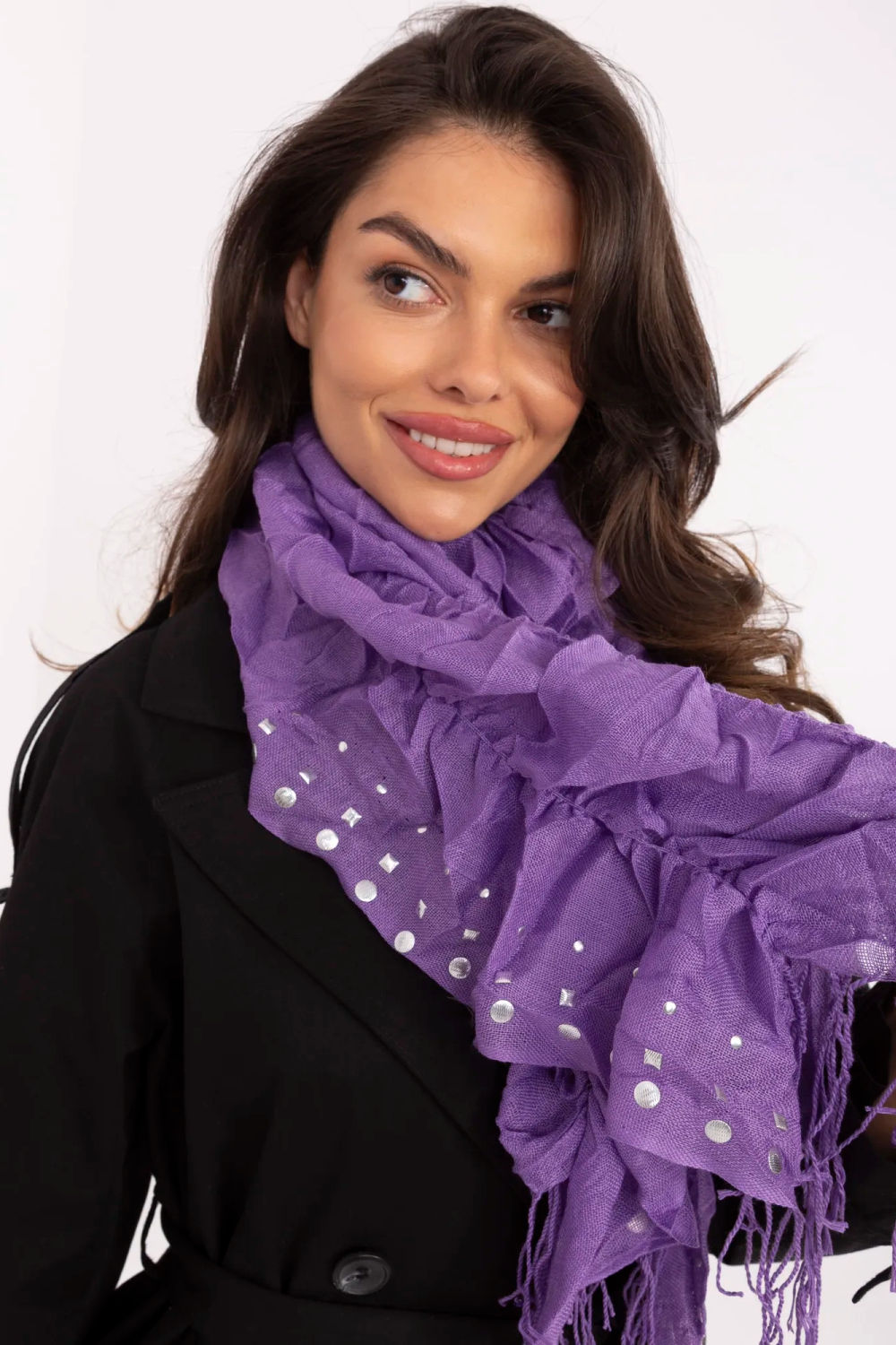 L’écharpe élégante avec des franges et des clous décoratifs est un accessoire spectaculaire qui complétera parfaitement les tenues quotidiennes et plus audacieuses. Fabriquée en viscose légère et agréable au toucher, elle se pose doucement autour du cou ou des épaules, offrant un confort de port. Avec des dimensions d’environ 134 cm de longueur et 47 cm de largeur, elle offre de nombreuses possibilités de stylisme, que ce soit portée de manière classique, lâche ou nouée de différentes façons. Les franges décoratives et les clous subtils confèrent à l’écharpe un caractère à la mode et attirent le regard, en faisant un accent exceptionnel pour toute tenue.