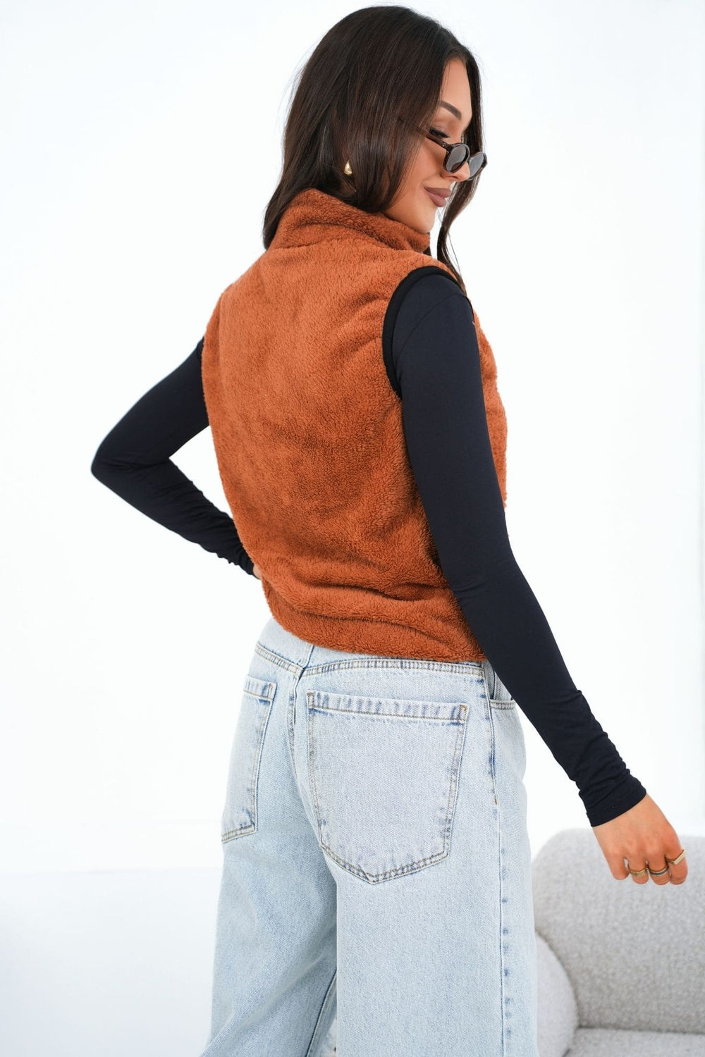 Un gilet stylé pour femme au caractère décontracté, idéal pour tous les jours. Fabriqué dans un matériau doux et moelleux avec une dominante de polyester, qui assure un confort de port et une agréable sensation de chaleur les jours plus frais. Modèle fermé par une fermeture éclair pratique, équipé de poches insérées pratiques et d’un col élégant protégeant le cou du vent. Le motif lisse donne au gilet un look polyvalent, ce qui le rend facile à assortir à de nombreuses tenues. Sa longueur standard en fait un excellent choix pour la saison automne-hiver-printemps, à porter aussi bien avec des pulls, des chemisiers ou des chemises. Modèle non doublé idéal pour les superpositions.