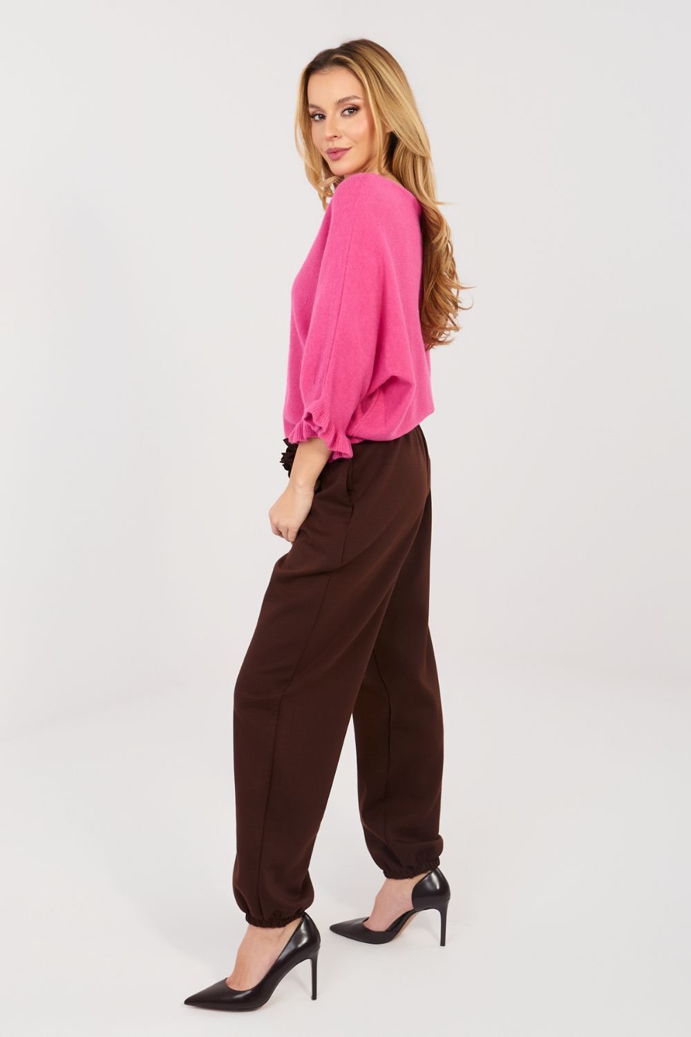 Pantalon de jogging élégant de type jogger est un mélange de confort et de finitions élégantes. Le modèle à jambes longues avec des poignets se pose parfaitement sur la silhouette, lui donnant un caractère moderne. Le motif lisse souligne leur polyvalence et les rend parfaits à la fois pour les tenues de tous les jours et plus sophistiquées. Une taille élastique cousue assure un ajustement confortable et un confort toute la journée. Les poches latérales ajoutent de la fonctionnalité, et une broche subtile en forme de fleur apporte une touche élégante et féminine. Les pantalons sont fabriqués dans un matériau incroyablement agréable au toucher, type beurre, d’un mélange doux et délicat de polyester, de viscose et d’élasthanne. Le tissu s’ajuste magnifiquement sur le corps, offrant une liberté de mouvement et un grand confort d’utilisation. C’est une proposition idéale pour les femmes qui apprécient le confort dans une version élégante.