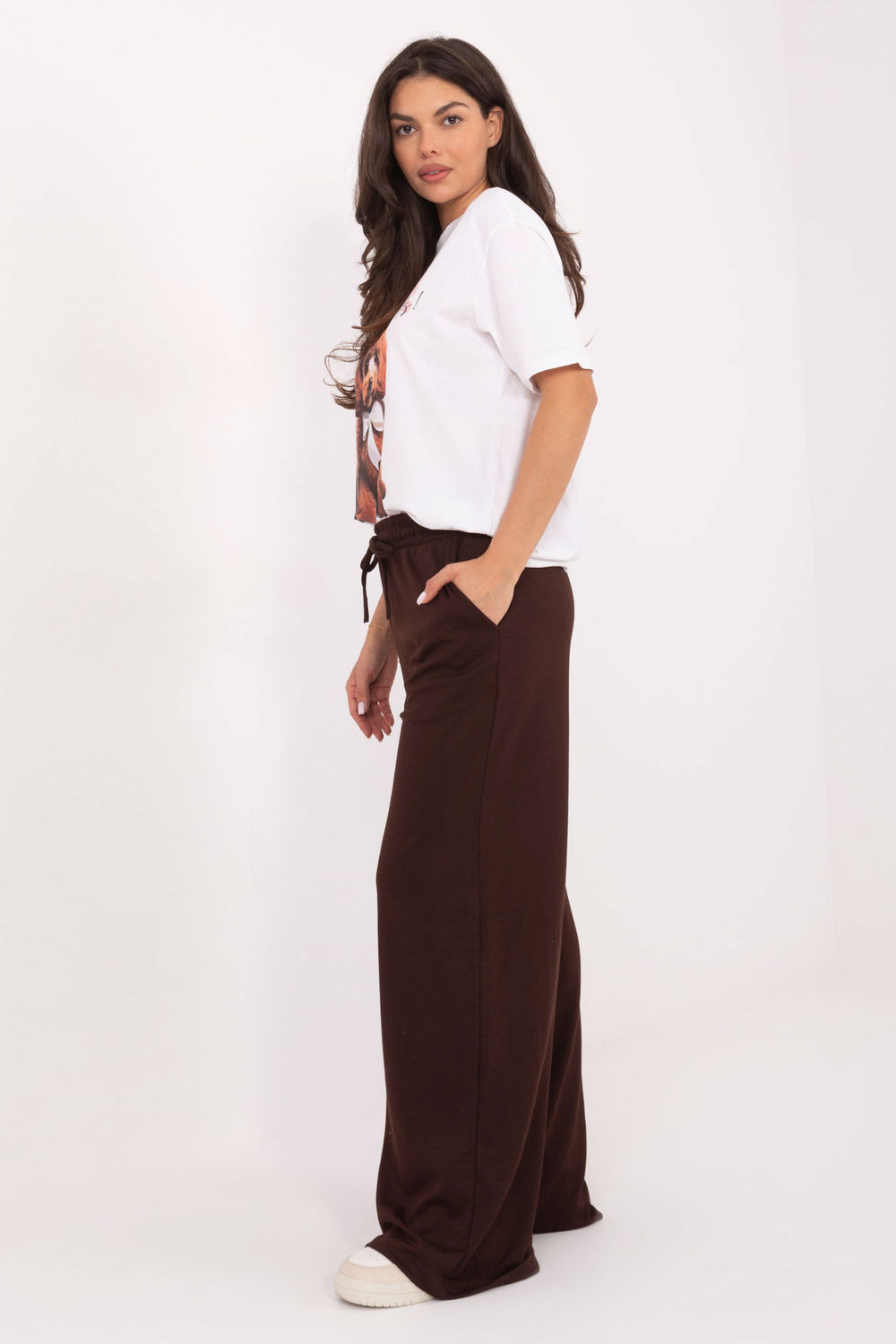 Pantalons de survêtement de style décontracté, parfaits pour tous les jours. Fabriqués dans un mélange doux de viscose, polyester et élasthanne, ils offrent confort, respirabilité et légère élasticité du matériau. La texture lisse du tissu leur confère un caractère universel, ce qui les rend faciles à assortir à de nombreuses tenues. Le modèle se distingue par sa taille haute et ses jambes larges qui se plient magnifiquement dans le mouvement, soulignant la coupe décontractée. Une ceinture pratique a été utilisée à la taille, permettant un ajustement à la silhouette, et des poches latérales insérées ajoutent de la fonctionnalité. Moderne et confortable, un excellent choix pour des tenues quotidiennes et décontractées.