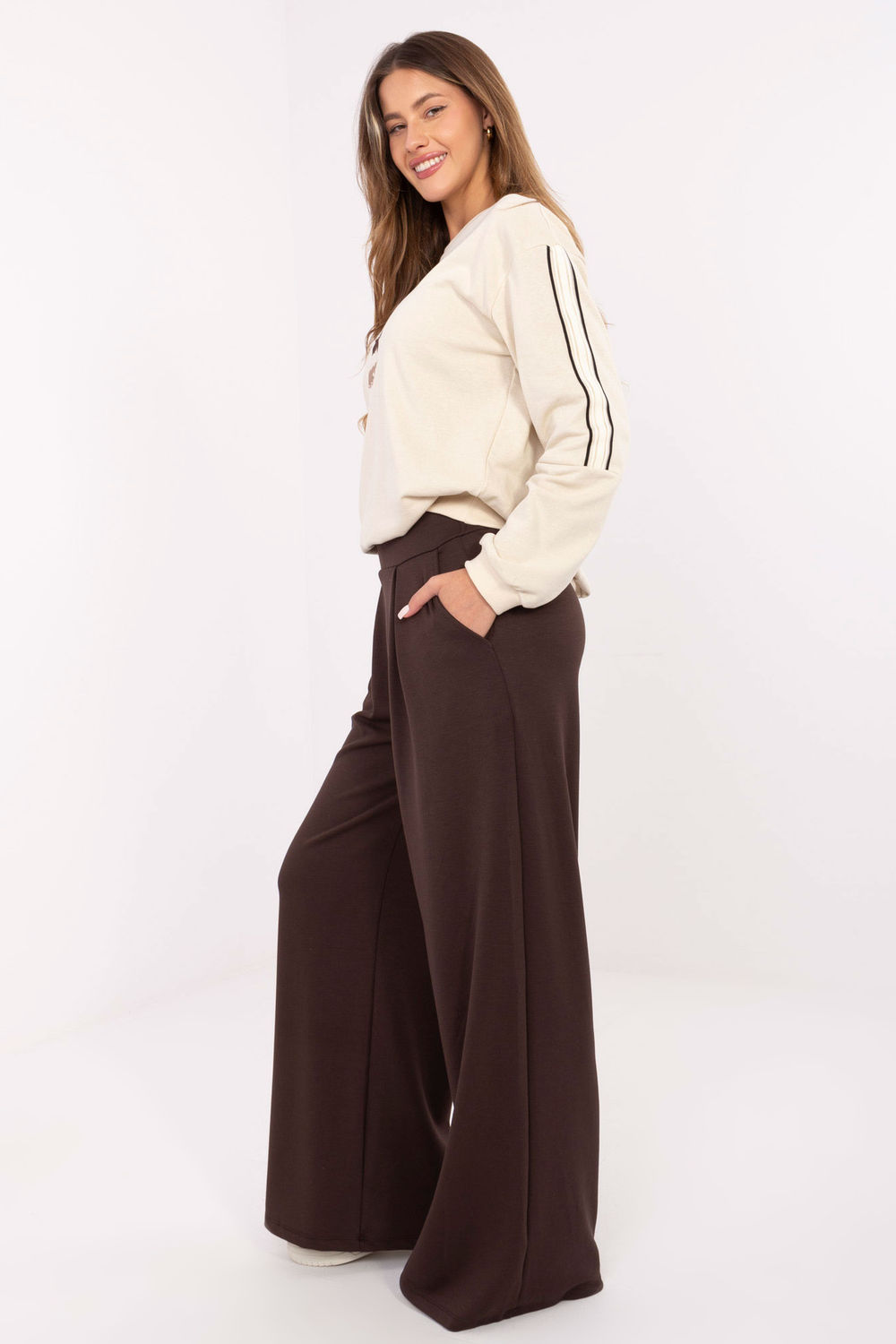 Pantalons de jogging stylés de type palazzo, combinant confort et élégance dans des tenues quotidiennes. Fabriqués dans un mélange doux de viscose, de polyester et d’élasthanne, ils assurent un confort de port et une liberté de mouvement. Le tissu lisse et les larges jambes leur donnent un caractère à la mode, légèrement oversize. La taille haute avec une bande élastique garantit un ajustement parfait à la silhouette, et les plis décoratifs sur le devant leur donnent un caractère exceptionnel. Modèle sans fermeture, équipé de poches latérales pratiques. Parfaits pour tous les jours, aussi bien pour des tenues sportives que plus élégantes.