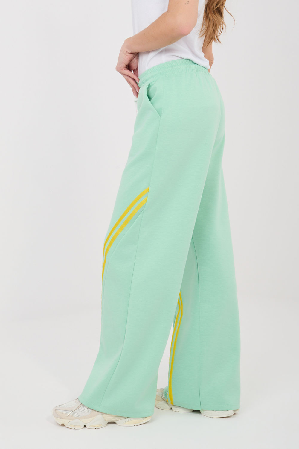 Les pantalons de jogging pour femmes sont une proposition confortable et élégante pour tous les jours, parfaite pour les femmes qui apprécient le confort et un look décontracté à la mode. Ils sont parfaits pour les activités quotidiennes, les promenades, les courses ou se détendre à la maison. Le modèle est fabriqué dans un mélange agréable au toucher de polyester, de viscose et d’élasthanne. Grâce à cela, les pantalons sont doux, élastiques et s’adaptent bien à la silhouette, offrant une liberté de mouvement totale. Les pantalons ont une taille haute, ce qui assure un confort de port et met joliment en valeur la taille. À la taille, il y a un laçage pratique permettant un ajustement individuel à la silhouette. Des poches pratiques sont placées sur les côtés, idéales pour les petits objets. Le tissu lisse confère aux pantalons un caractère universel, tandis que les bandes latérales obliques placées à l’avant des jambes ajoutent une touche moderne et sportive-élégante à l’ensemble. C’est un excellent choix pour les femmes qui veulent allier le confort des survêtements à un look quotidien à la mode.