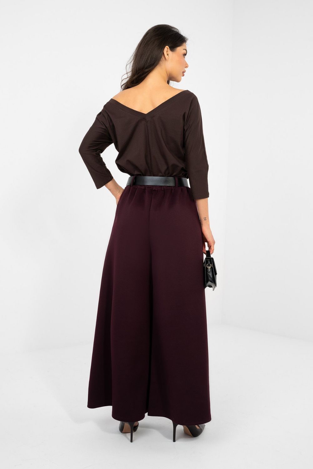 Pantalons de survêtement élégants de type palazzo sont une combinaison de confort et d’élégance dans une version moderne. Fabriqués à partir d’un mélange de viscose, de polyester et d’élasthanne de haute qualité, ils séduisent par leur tissu type beurre incroyablement doux, délicat et très agréable au toucher. Le tissu se pose magnifiquement sur la silhouette, offrant un confort tout au long de la journée. Le modèle à taille haute a une bande élastique à la taille qui garantit un ajustement parfait sans sensation de compression. De plus, la ceinture avec boucle souligne la taille et donne à l’ensemble un caractère élégant. L’absence de fermeture classique augmente le confort d’utilisation. Les larges jambes de style palazzo confèrent légèreté et liberté à la silhouette, tandis que les plis décoratifs sur le devant ajoutent un accent raffiné aux pantalons. Le motif lisse rend le modèle polyvalent et facile à styliser, parfait pour un usage quotidien ou professionnel. Les poches latérales insérées augmentent la fonctionnalité, alliant praticité et style élégant.