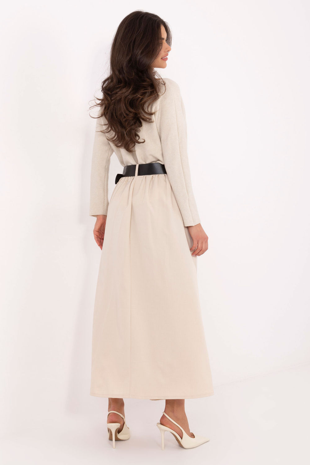 Jupe longue évasée maxi élégante et féminine avec des contre-plis sur le devant, alliant confort et style classique adapté aussi bien au travail qu’aux sorties quotidiennes. Fabriqué à partir d’un mélange de viscose et de polyester de haute qualité, il est léger, aéré et se porte magnifiquement sur la silhouette. Le modèle a une bande élastique à l’arrière pour un ajustement parfait à la taille, ainsi qu’une ceinture fermée permettant de subtilement accentuer la silhouette. Les poches latérales insérées ajoutent de la fonctionnalité, et les contre-plis à l’avant donnent à la jupe une forme élégante et évasée. La jupe a un motif lisse, pas de fermeture classique et une longueur maxi, ce qui la rend polyvalente et facile à styliser. C’est une proposition idéale pour les occasions quotidiennes, les sorties et les événements élégants, alliant confort et coupe intemporelle.