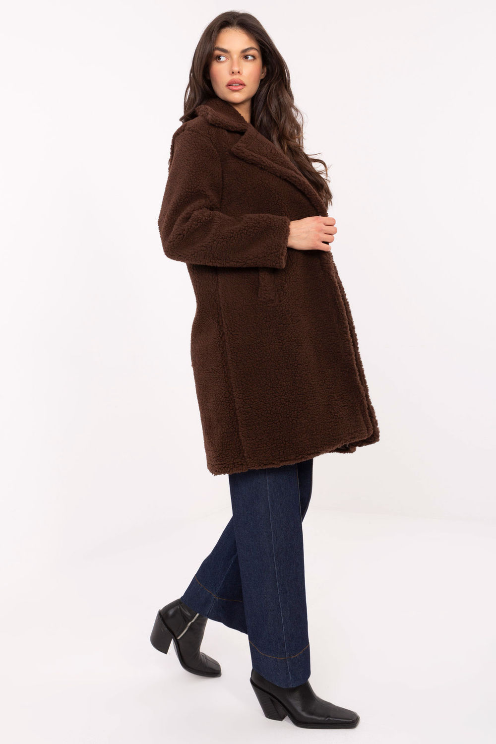 Le manteau en fausse peau de mouton pour femme est le choix idéal pour les jours plus frais de l’automne et de l’hiver. Fabriqué en polyester doux avec une texture variée, il enchante par sa finition agréable au toucher et son aspect élégant. Le col avec de grands revers ajoutent de l’élégance, tout en soulignant son caractère décontracté et urbain. Le modèle qui arrive au-dessus du genou est parfait pour la silhouette, et sa coupe plus ample assure un confort de port et la possibilité de porter un pull en dessous. La fermeture à boutons simples ajoute un charme classique, tandis que les poches insérées sont un élément pratique pour un usage quotidien. Le manteau est doublé, ce qui le fait bien tomber et augmente le confort de port, même s’il n’a pas d’isolation supplémentaire.