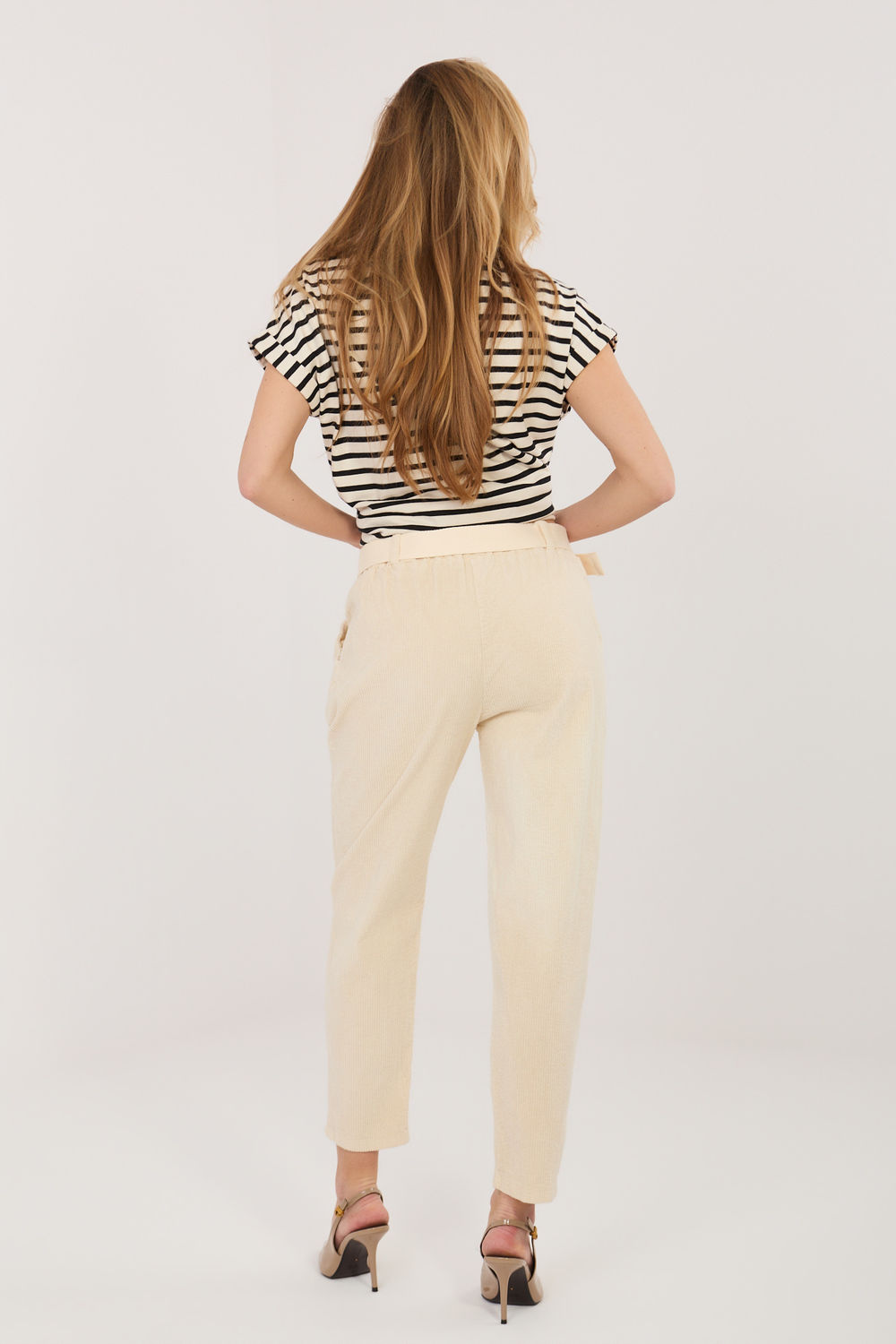 Pantalon en velours côtelé pour femme de coupe élégante de type cigarette, parfait pour les tenues quotidiennes. Fabriqué à partir d’un mélange de coton de haute qualité et d’élasthanne, il assure un confort de port, une élasticité et un ajustement parfait à la silhouette. Le modèle avec une taille élastique garantit confort et liberté de mouvement, tandis que la ceinture supplémentaire souligne la taille et donne un caractère stylé à l’ensemble. Les jambes fuselées de longueur 7/8 affinent visuellement la silhouette et lui donnent un aspect moderne. Les pantalons au motif lisse, sans fermeture classique, sont équipés de poches latérales pratiques, alliant fonctionnalité et élégance intemporelle.