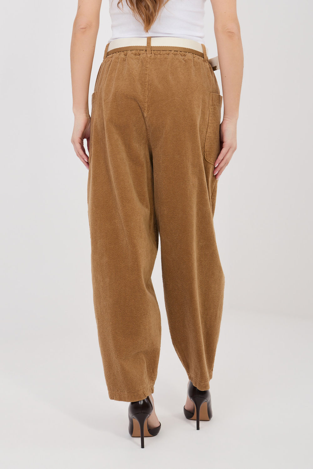 Pantalon stylé pour femme en velours côtelé est une excellente proposition pour des tenues décontractées et quotidiennes. La coupe de type carotte se caractérise par une forme plus ample au niveau des hanches et des jambes fuselées, assurant ainsi un confort de port et un look moderne. Le modèle à taille haute souligne joliment la taille et allonge visuellement la silhouette. Une bande élastique a été insérée à la taille pour un ajustement confortable sans avoir besoin de fermeture. Un atout supplémentaire est la ceinture fermée, mettant en valeur la taille et ajoutant une touche stylée. Les pantalons n’ont pas de fermeture classique, ce qui augmente le confort d’utilisation. Ils sont équipés de poches ouvertes et insérées sur les côtés, pratiques et ajoutant une touche décontractée à l’ensemble. Fabriqués à partir d’un mélange de coton de haute qualité et d’élasthanne, ils sont doux, agréables au toucher et légèrement élastiques, s’adaptant ainsi parfaitement à la silhouette. Le motif lisse rend le modèle polyvalent et facile à styliser, idéal pour tous les jours, au travail ou pour une rencontre.