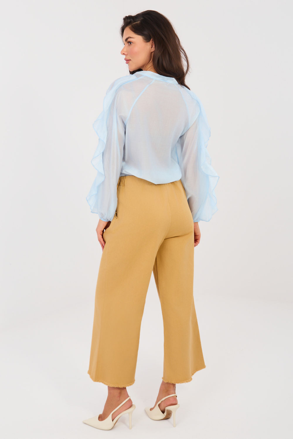 Pantalon large pour femme de style décontracté est une proposition confortable et élégante pour tous les jours et pour le travail. Fabriqué en coton de haute qualité avec une touche d’élasthanne, il assure un confort de port, une élasticité et un bon ajustement à la silhouette. Le modèle lisse avec une taille haute met joliment en valeur la taille, tandis que la ceinture élastique cousue dans la taille garantit confort et liberté de mouvement. Les larges jambes ornées d’une finition élégante confèrent aux pantalons un caractère moderne et tendance. Les pantalons n’ont pas de fermeture éclair, ce qui augmente encore le confort d’utilisation. Les poches latérales pratiques ajoutent de la fonctionnalité au modèle. Parfait pour les tenues de tous les jours avec une chemise, un chemisier ou un pull.