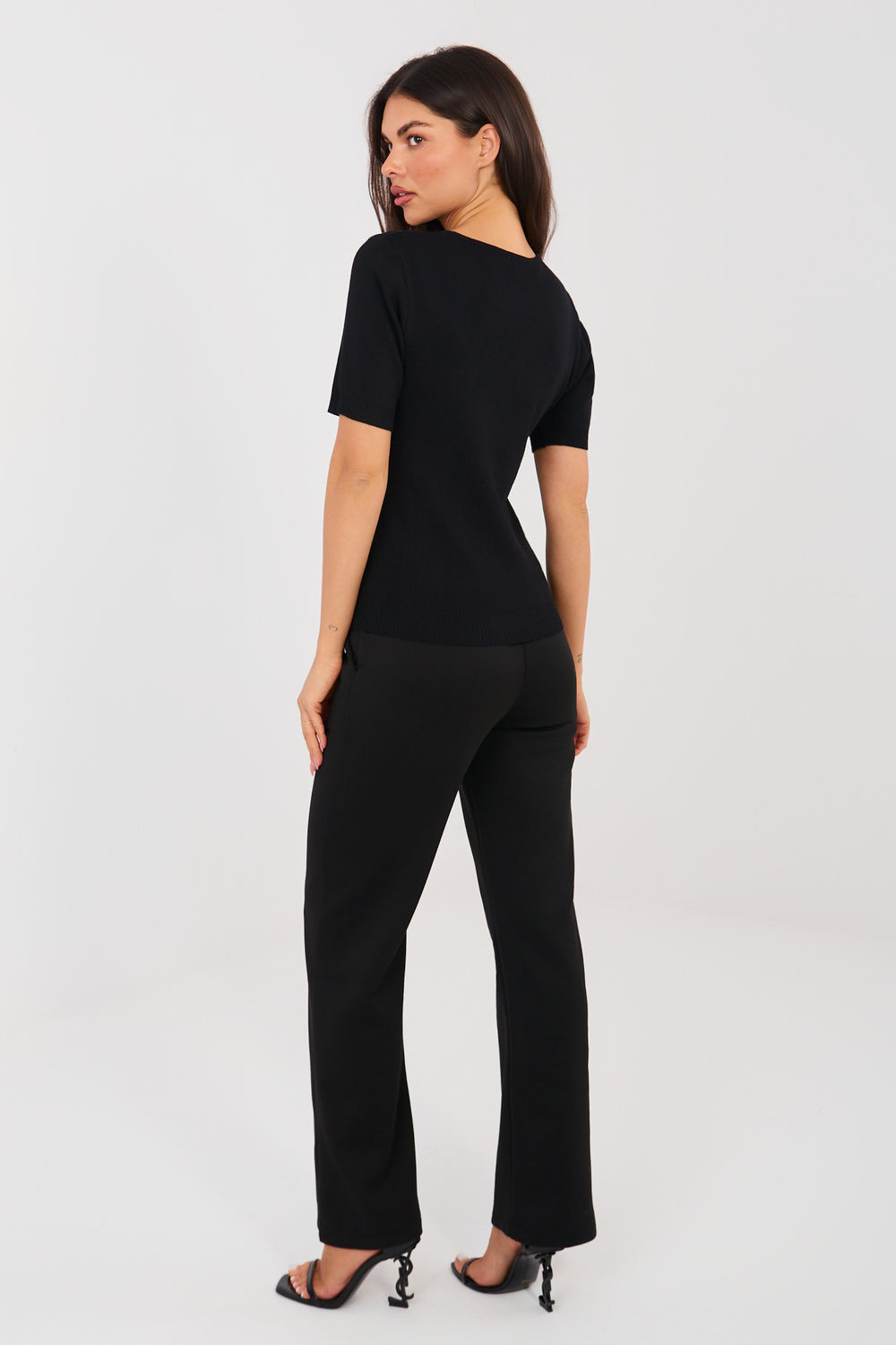 Pantalon pour femme élégant en matériau de type straight leg, qui séduit non seulement par son apparence, mais aussi par son confort de port. Fabriqué à partir d’un matériau exceptionnellement agréable au toucher, doux, délicat et lisse, il procure une sensation de luxe sur la peau tout au long de la journée. Le modèle à taille haute souligne joliment la taille et allonge optiquement la silhouette, tandis que les jambes droites confèrent à l’ensemble un caractère intemporel et élégant. Le pantalon est fermé par une fermeture éclair et un bouton, garantissant une finition classique et esthétique. Les poches latérales insérées ajoutent de la fonctionnalité sans perturber la ligne du vêtement. Grâce au motif lisse et au mélange soigneusement sélectionné de polyester, viscose et élasthanne, ces pantalons conviennent parfaitement aux tenues de tous les jours, au travail et aux occasions spéciales. C’est une base Taille unique pour une garde-robe élégante, confortable, stylée et toujours à la mode.