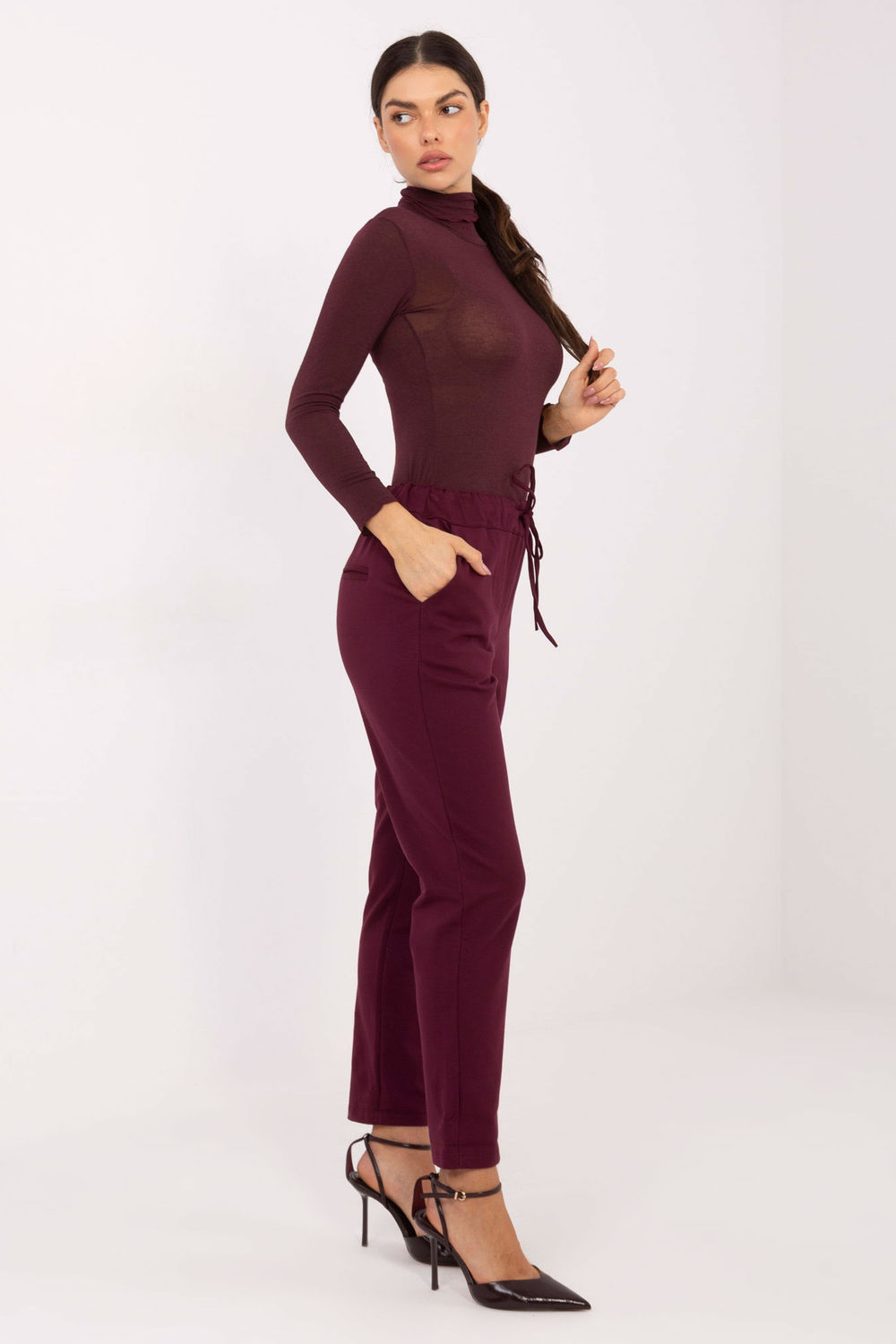 Les pantalons pour femmes en tissu de style casual sont une proposition confortable et polyvalente pour tous les jours. Fabriqués à partir d’un mélange de coton, d’élasthanne et de nylon de haute qualité, ils offrent un confort de port, une élasticité et une durabilité. Le tissu lisse leur donne un caractère intemporel, facile à assortir à différents styles. Le modèle à taille haute souligne joliment la taille et assure un ajustement confortable. Les jambes fuselées à la longueur 7/8 donnent aux pantalons un aspect moderne et allongent visuellement la silhouette. La ceinture à nouer permet un ajustement individuel, et les poches latérales pratiques augmentent la fonctionnalité. Les pantalons seront parfaits dans des tenues quotidiennes, que ce soit avec un chemisier, un pull ou un sweat-shirt sportif.