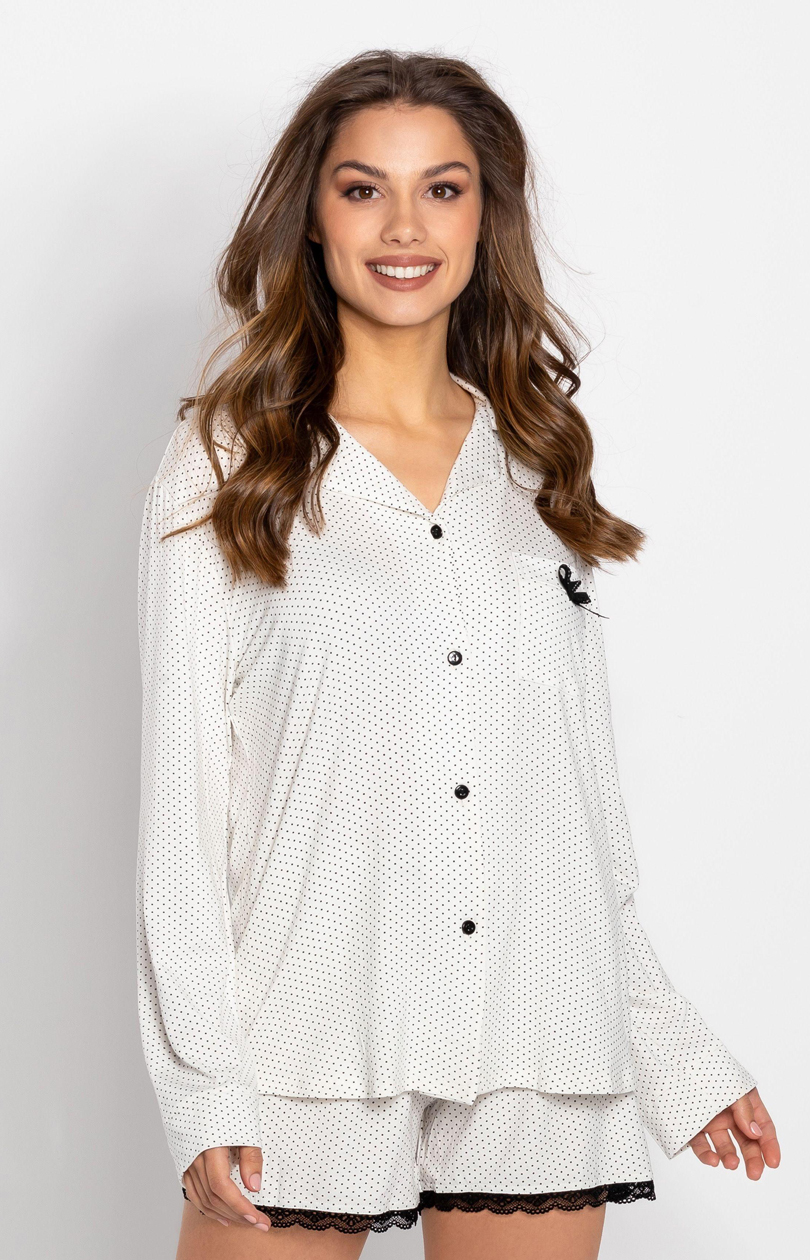 Pyjama pour dames composé d’une chemise et d’un short. Chemise boutonnée à manches longues avec une poche sur le devant. Short à la coupe ample et confortable, avec dentelle décorative.