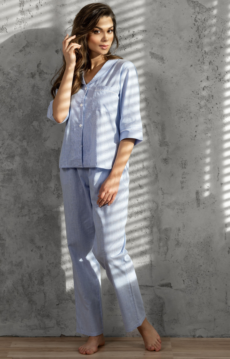 Le pyjama pour femmes est le choix idéal pour les femmes qui apprécient le confort et l’élégance. Fabriqué dans un tissu de haute qualité, doux et aéré, ce pyjama deux pièces garantit le confort pendant le sommeil et la détente. La chemise, boutonnée, a des manches 3/4 à la mode, terminées par des poignets délicats. D’élégants passepoils ajoutent une touche de chic et de classe. Une poche poitrine ajoute un élément pratique tout en apportant une touche subtile. Le pyjama a une coupe oversize féminine, ce qui le rend agréable à porter. La coupe ample s’harmonise parfaitement avec la maille douce, tandis que le pantalon avec poches et ceinture élastique assure confort et liberté de mouvement. Il convient de noter que le pyjama est fabriqué à partir de matériaux naturels, ce qui le rend agréable à porter. Le certificat OEKO-TEX Standard 100 confirme la sécurité des matières premières utilisées, ce qui est important pour ceux qui se soucient de l’écologie et de leur propre santé. L’ensemble de deux pièces, composé d’une chemise et d’un pantalon long, est parfait non seulement pour sortir le soir, mais aussi comme tenue élégante pour se détendre à la maison. Le pyjama a été conçu et cousu en Pologne, ce qui garantit une grande qualité de fabrication. Ce pyjama pour femme plaira certainement aux femmes qui recherchent une combinaison de confort, d’élégance et de savoir-faire polonais. Il est également idéal comme cadeau pour un être cher.