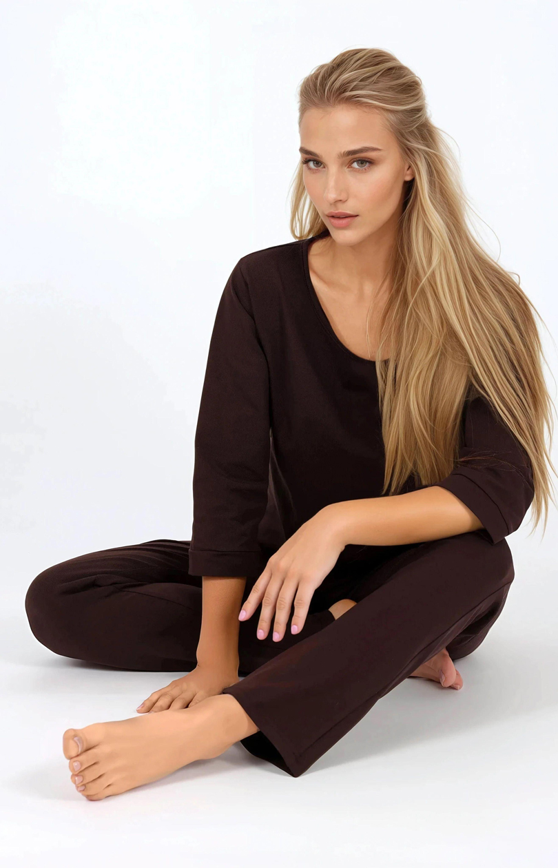 Ce pyjama en deux parties associe le style féminin au confort et à l’élégance, idéal pour se reposer la nuit et comme vêtement d’intérieur. Le haut à manches 3/4 et col en U crée une silhouette subtile mais féminine, tandis que les manchettes aux manches lui ajoutent un caractère classique. Fabriqué dans un tissu doux et respirant, le pyjama est hypoallergénique et certifié OEKO-TEX Standard 100, garantissant qu’il est sûr pour la peau. Le pantalon slim à jambe longue, avec une taille élastique, s’adapte parfaitement à la silhouette, et l’absence de poches et la coupe minimaliste lui ajoutent de la légèreté. Le produit est entièrement fabriqué à partir de matériaux naturels, conçu et cousu en Pologne, garantissant une qualité de fabrication optimale.
