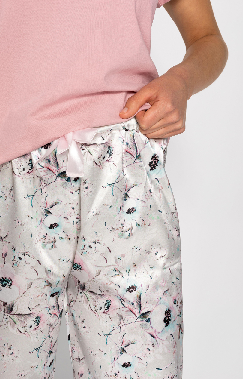 Élégant pyjama deux-pièces dans lequel vous vous posez en femme exceptionnelle. Son secret : un pantalon en très beau satin argenté, recouvert d’un délicat motif floral aux couleurs pastel. Les fleurs avec un effet aquarelle sont tout simplement phénoménales et attirent le regard. La coupe est ample, confortable et galbée. T-shirt de couleur délicate rose poudré, fini avec une garniture en satin sur l’encolure en V. Haute qualité.