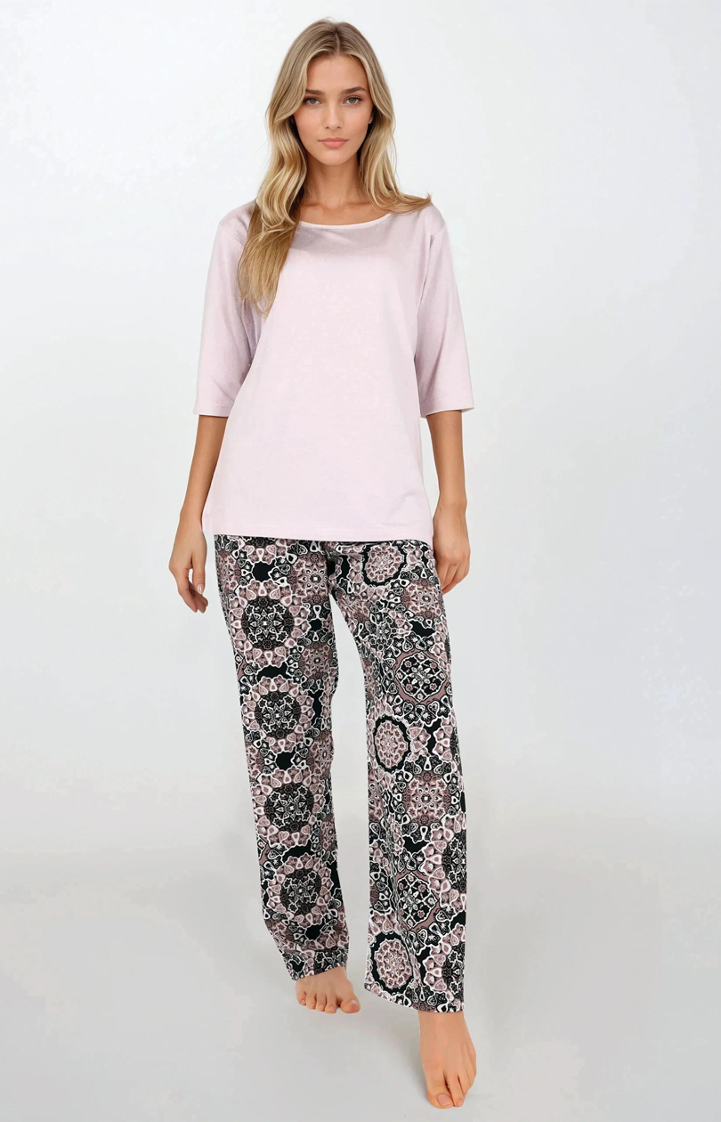 Pyjama pour femme élégante et confortable en ensemble de 2 pièces, conçue pour la détente quotidienne et l’esthétique féminine. Le haut à manches 3/4 et col rond est subtil et élégant, parfait également comme vêtement d’intérieur. Dans des tons délicats, le pyjama met en valeur la grâce naturelle et le style féminin. La coupe ample et confortable du pantalon avec des jambes longues et une taille élastique assure une liberté de mouvement et un confort toute la nuit. L’ensemble est fabriqué dans un matériau doux et agréable au toucher qui enveloppe le corps de douceur. C’est un choix parfait pour les soirées tranquilles et les matins paresseux avec style, confort et classe.