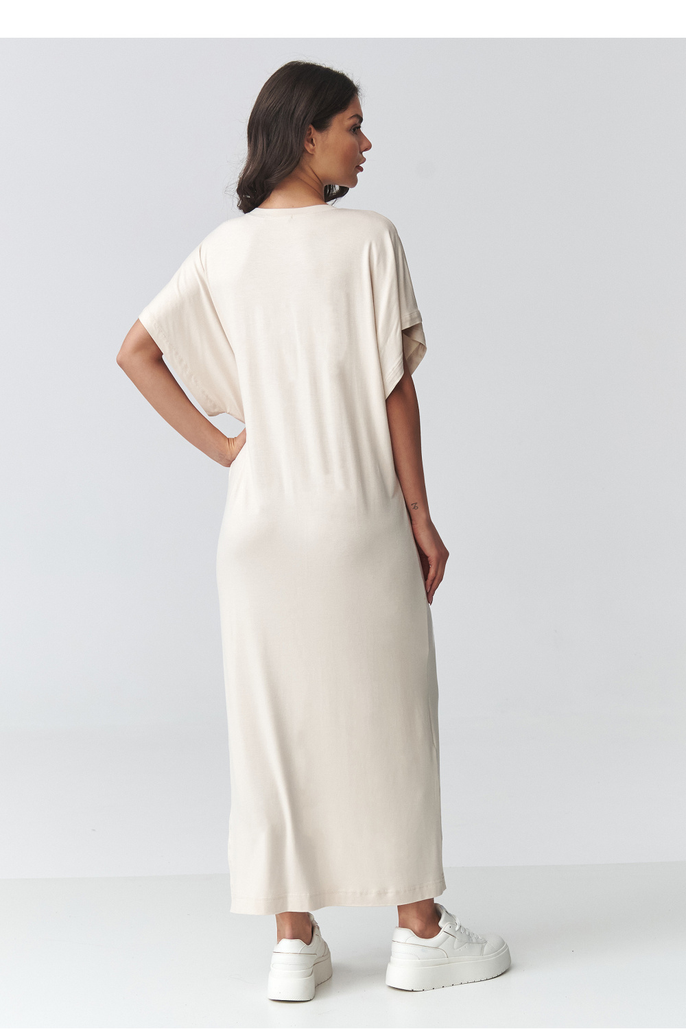 La robe maxi oversize élégante est un parfait mélange de confort et de minimalisme moderne. La coupe ample assure une liberté de mouvement, et la coupe simple fait que le modèle s’adapte parfaitement à différents types de silhouette. C’est une proposition idéale pour les femmes qui apprécient le confort et le style intemporel. Le modèle a un décolleté classique et couvert ainsi que des manches courtes et larges qui soulignent le caractère décontracté de la tenue. La longueur maxi associée à une fente spectaculaire sur le côté ajoute de la légèreté et met subtilement en valeur la jambe, donnant à l’ensemble une touche féminine. Le tissu doux et agréable au toucher fait que la robe pour femme convient aussi bien pour le travail que pour les balades ou les rencontres entre amis. C’est une robe longue polyvalente avec une fente que vous pouvez styliser de différentes manières, avec des baskets pour un look sportif ou avec des accessoires élégants pour un effet plus chic. Grâce à sa coupe simple, elle constitue une excellente base pour créer des ensembles tendance tout au long de la saison.