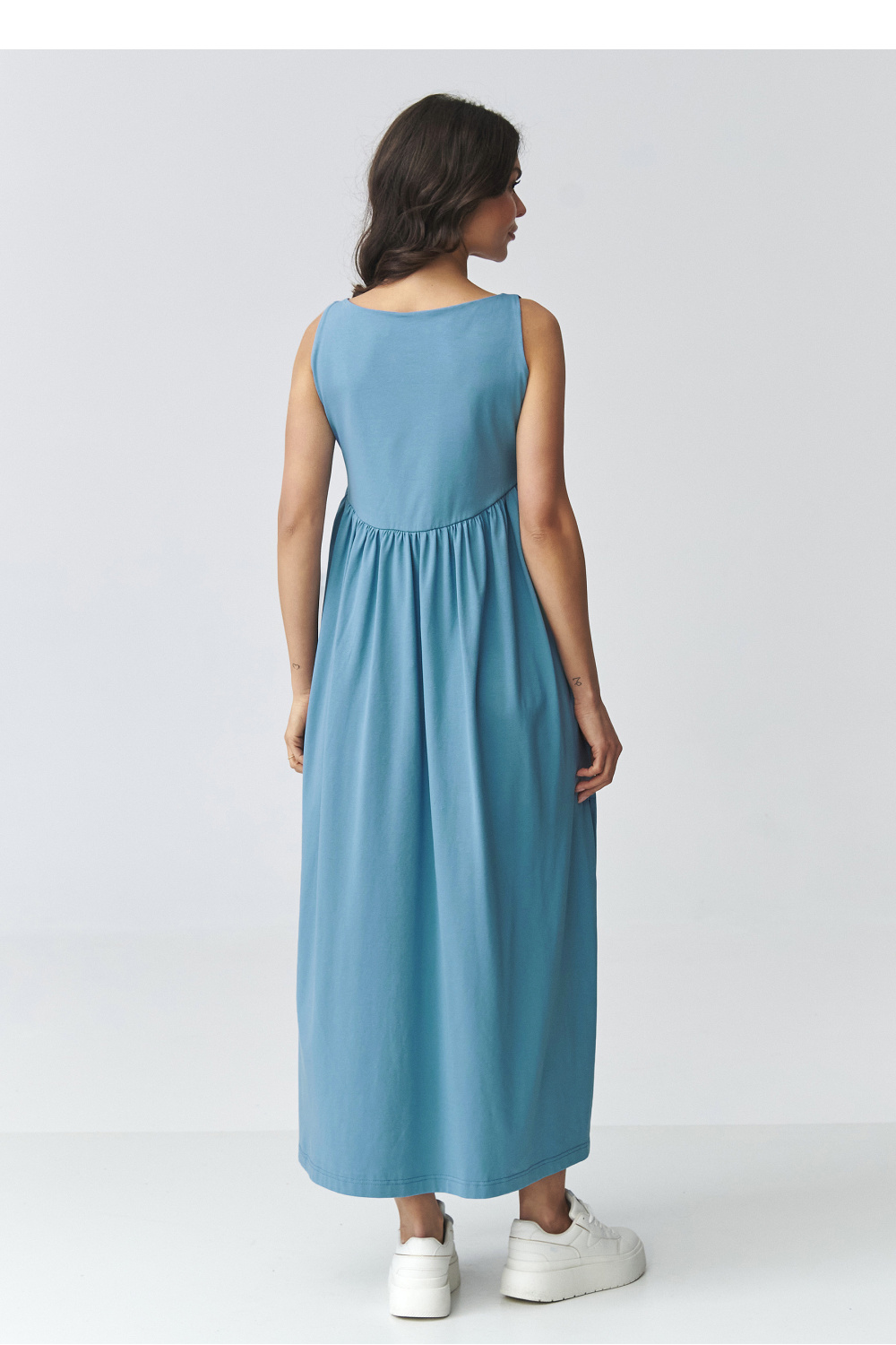 Une robe maxi élégante et décontractée est une proposition idéale pour les femmes qui apprécient le confort et le design intemporel. Le modèle a une jupe légèrement évasée et des fentes spectaculaires sur les côtés, qui ajoutent de la légèreté et mettent en valeur la silhouette. La forme lisse fait que la robe convient parfaitement aussi bien pour tous les jours que pour des tenues plus élégantes. Le matériau aéré utilisé assure un confort toute la journée, et la coupe ample garantit une liberté de mouvement. Les poches pratiques augmentent la fonctionnalité, et le haut intégré avec de légères fronces à la taille modélise subtilement les proportions de la silhouette. Il s’agit d’une robe longue pour femme polyvalente, que vous pouvez facilement assortir à la fois avec des chaussures de sport et des accessoires plus élégants. Idéale pour une promenade, une réunion, un voyage de vacances ou des sorties quotidiennes.